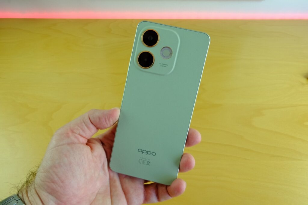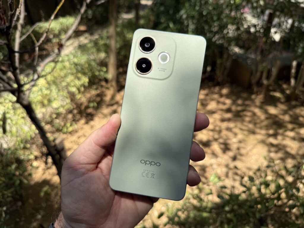 Oppo A5 Pro 4G kutudan çıkar çıkmaz sade ama güven telkin eden bir yüzle selamlıyor; gövde ölçüleri 164.8 × 75.5 × 7.8 mm olarak belirlenmiş ve 194 g ağırlıkta, yani elde tuğla hissi yaratmadan dolu dolu bir sağlamlık sunuyor. Köşeler yuvarlatılmış, ön yüzeyi kaplayan Gorilla Glass 7i adım başı anahtarla çarpışacak anlarda bile çizik endişesini hafifletiyor. Mat dokulu arka panel iki farklı karaktere bürünebiliyor: Zeytin Yeşili vegan deri kaplama sıcak ve yumuşak, Mocha Kahverengisi mat cam ise serin ve şık. Arka kısımda dikdörtgen modüle yerleştirilen ikili kamera çıkıntısı minimal yükseklikte, masaya bırakıldığında sallantıyı en aza indirmek için ortalanmış. Telefonu çevreleyen plastik çerçeve parlak değil fakat işçiliği sağlam, renk tonları arka yüzeyle uyumlu ve böylelikle bütçe segmentinde sırıtacak bir görüntü oluşmuyor.