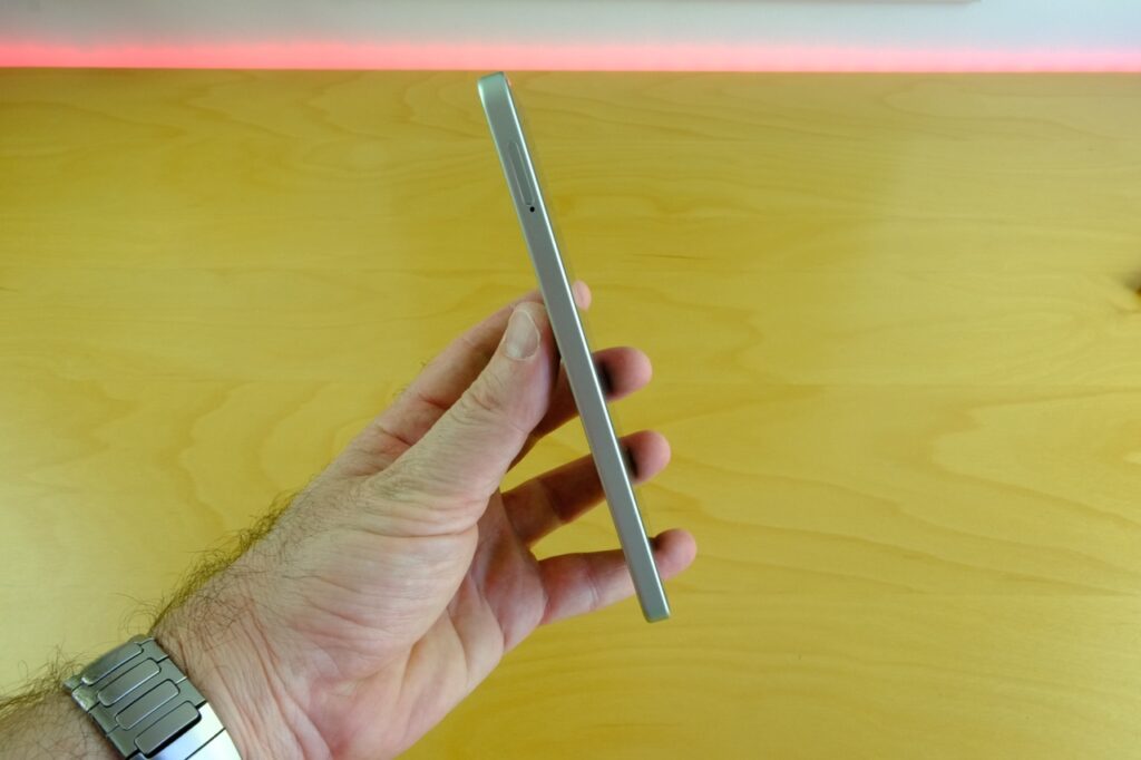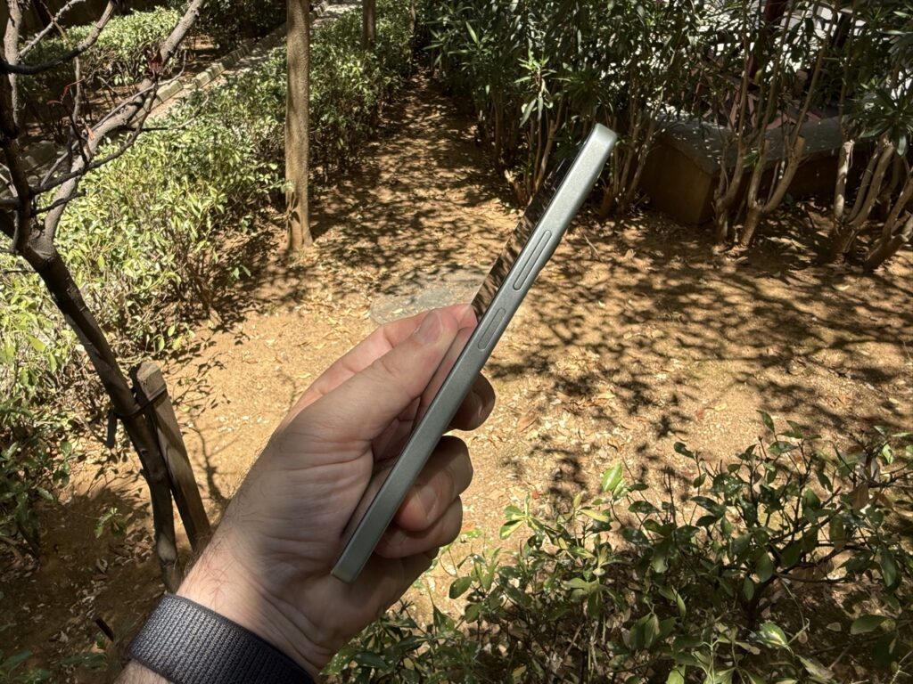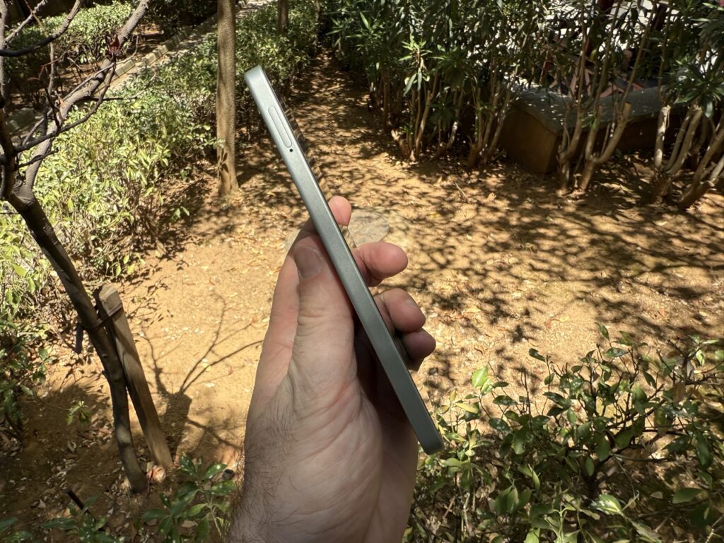 Malzeme hissiyatı günlük kullanım ergonomisine de yansıyor; mat kaplama parmak izi tutmuyor, vegan deri varyant terlemeyi azaltıyor ve elde kaymayı önlüyor. Sağ kenardaki güç tuşu aynı zamanda parmak izi okuyucu işlevini görüyor, hem konum hem hız bakımından tatmin edici çalışıyor. Ses tuşları hemen üzerinde, tek elle erişilebilir seviyede konumlanmış, basış hissi belirgin, gevşeklik yok. Alt kenarda USB-C portu, mikrofon ve hoparlör ızgarası yan yana, fakat 3.5 mm kulaklık girişi yok, bu nedenle kablolu kulaklık sevenlerin ya adaptör kullanması ya da kablosuza geçmesi gerekiyor. Çift SIM tepsisi sol tarafta, ikinci yuva microSD kartı da kabul ettiği için depolama alanının yetmediği anlarda anında genişletme avantajı sunuyor.