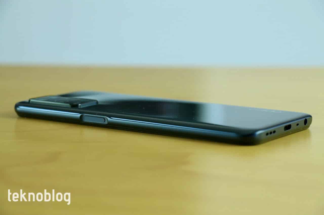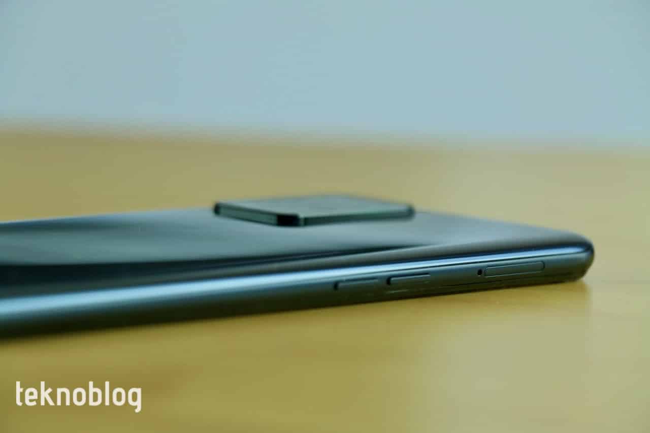 Oppo A54’ün üst kenarında herhangi bir şey bulunmuyor. Sol kenarda ise nano SIM ve microSD kart tepsisinin yerleştirildiği yuva ve ses kontrol tuşları yer alıyor. Telefonun güç butonu ise sağ kenarda bulunuyor. Güç butonu, performansına daha sonra değineceğimiz parmak izi tarayıcısına da ev sahipliği yapıyor.