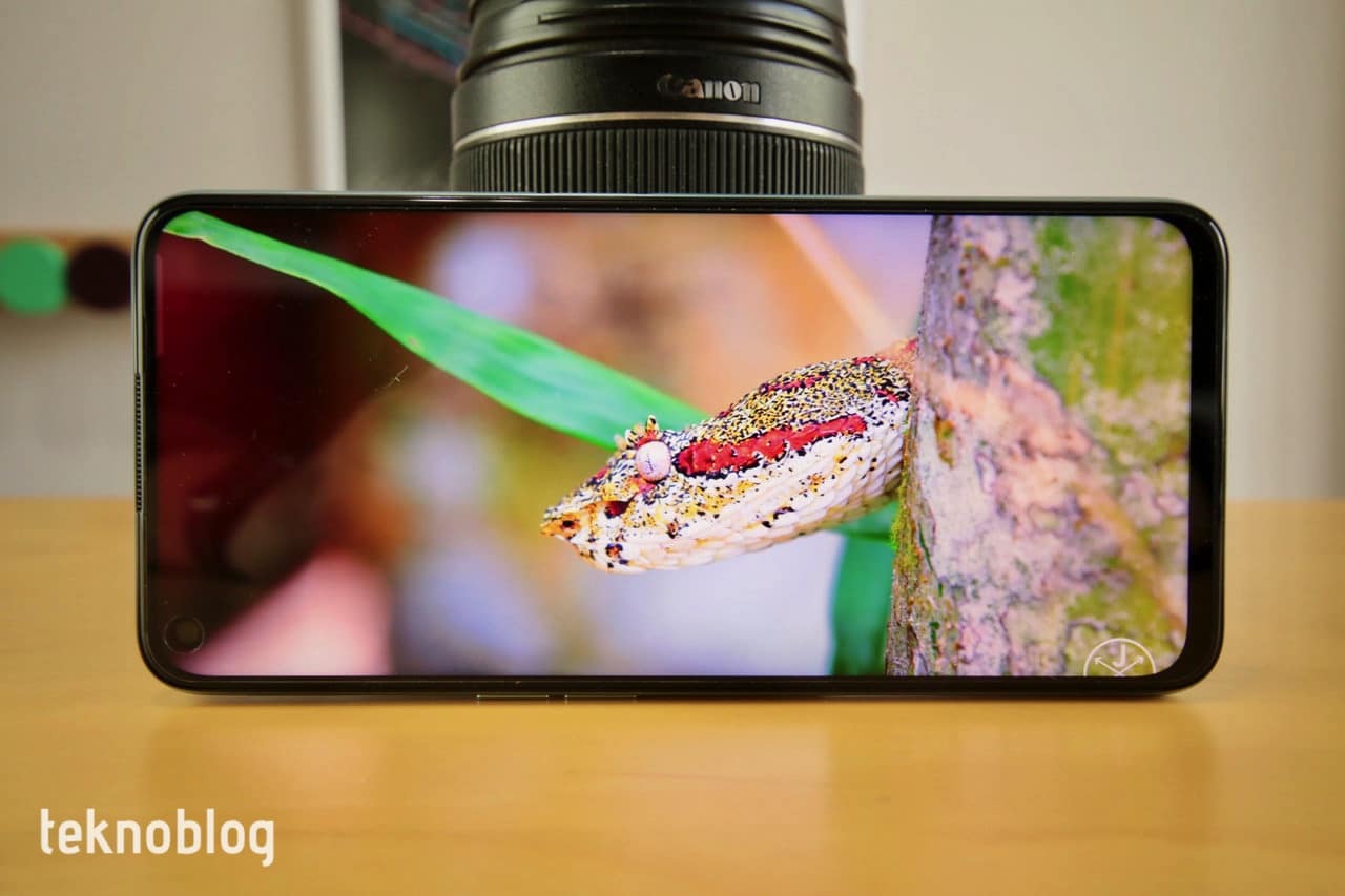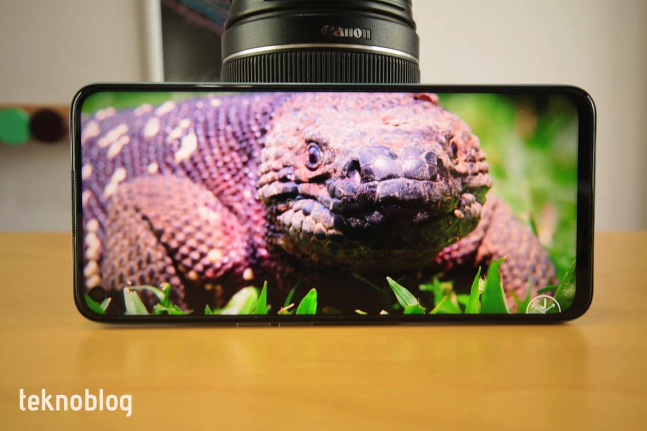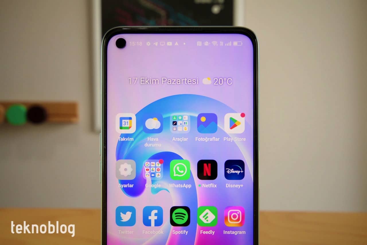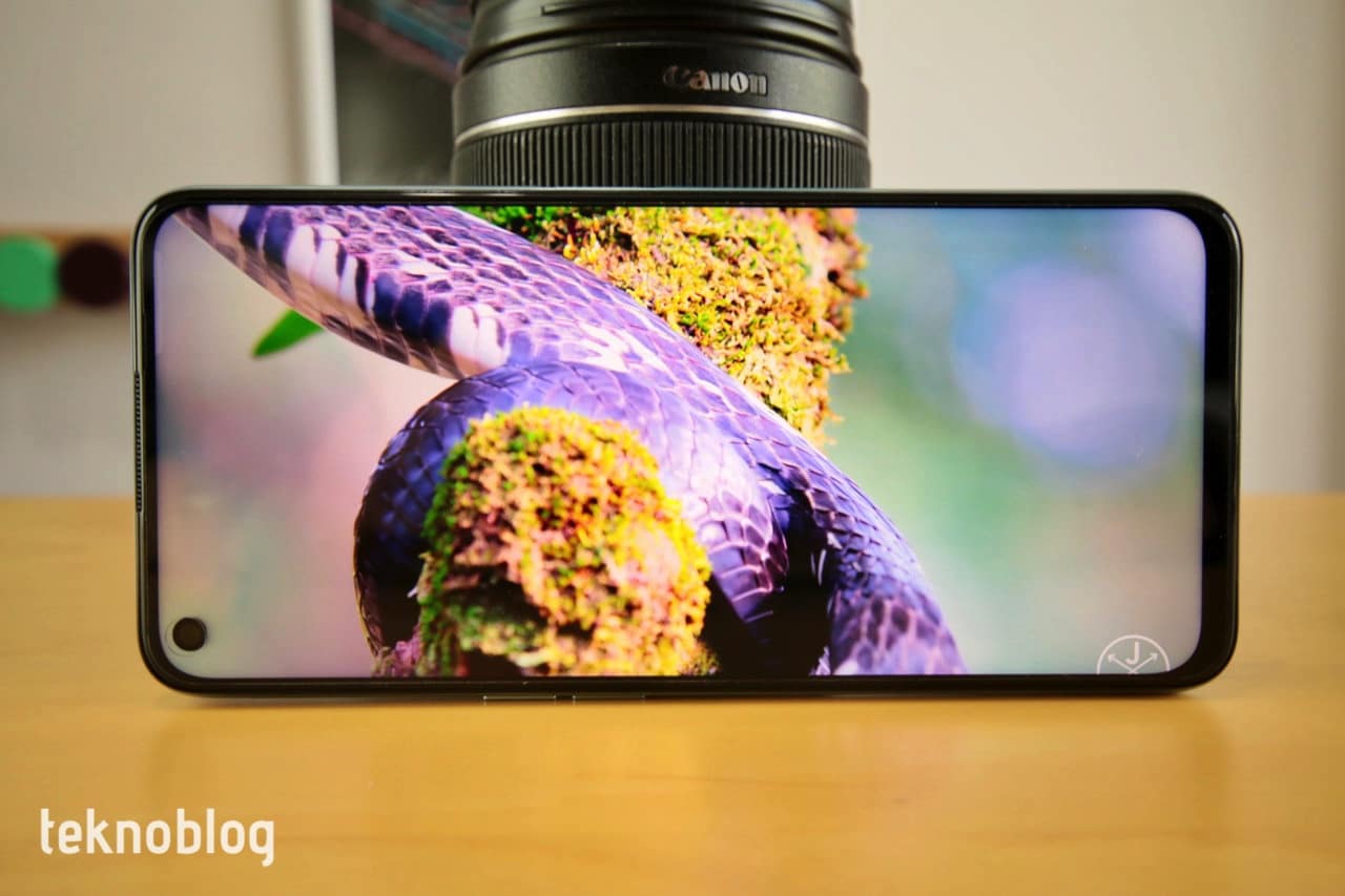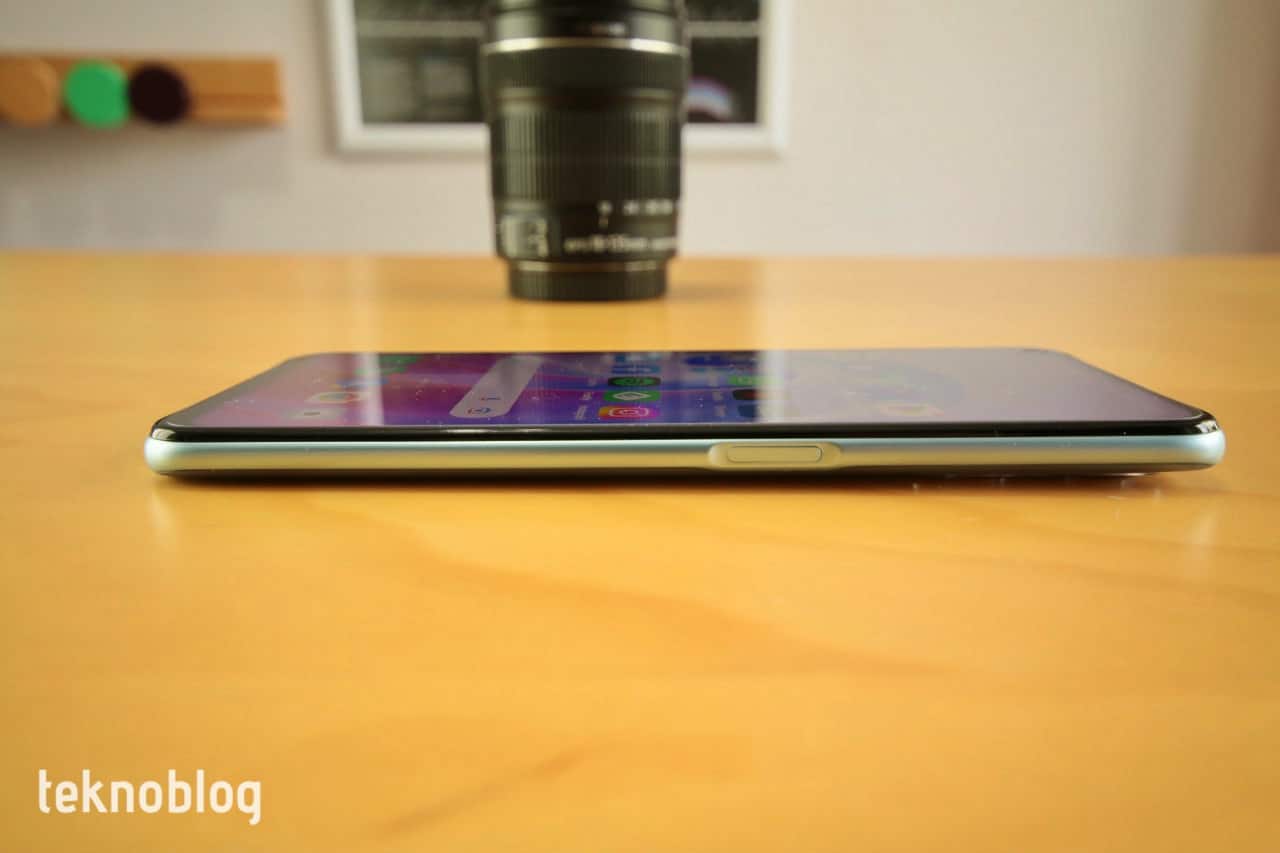 İlginçtir ki, gün batımı mavisi rengi, diğer renkten 0,1 mm daha kalın, ancak bunun etkisini hiç hissetmeyeceğinizi düşünebiliriz. Kenarlara doğru kavis yapan arka panel sayesinde, telefon uzun kenarlarda daha ince bir profile sahip. Bu durum telefonu biraz daha ince gösteriyor ve tutuşu da kolaylaştırıyor. Ön tarafta yüzde 84’lük bir ekran-gövde oranı elde edilmesini sağlayan yerleşim var. Ekranın etrafını saran çerçevenin çok ince sayılmaz. Ekranın üst kısmında, ön yüzün bitiminde ahize hoparlörü var. Ekranın sol üst köşesine ise selfie kamera deliği yerleştirilmiş. Alt kenardaki çene bölümü ise diğer kenarlara göre biraz daha kalın.