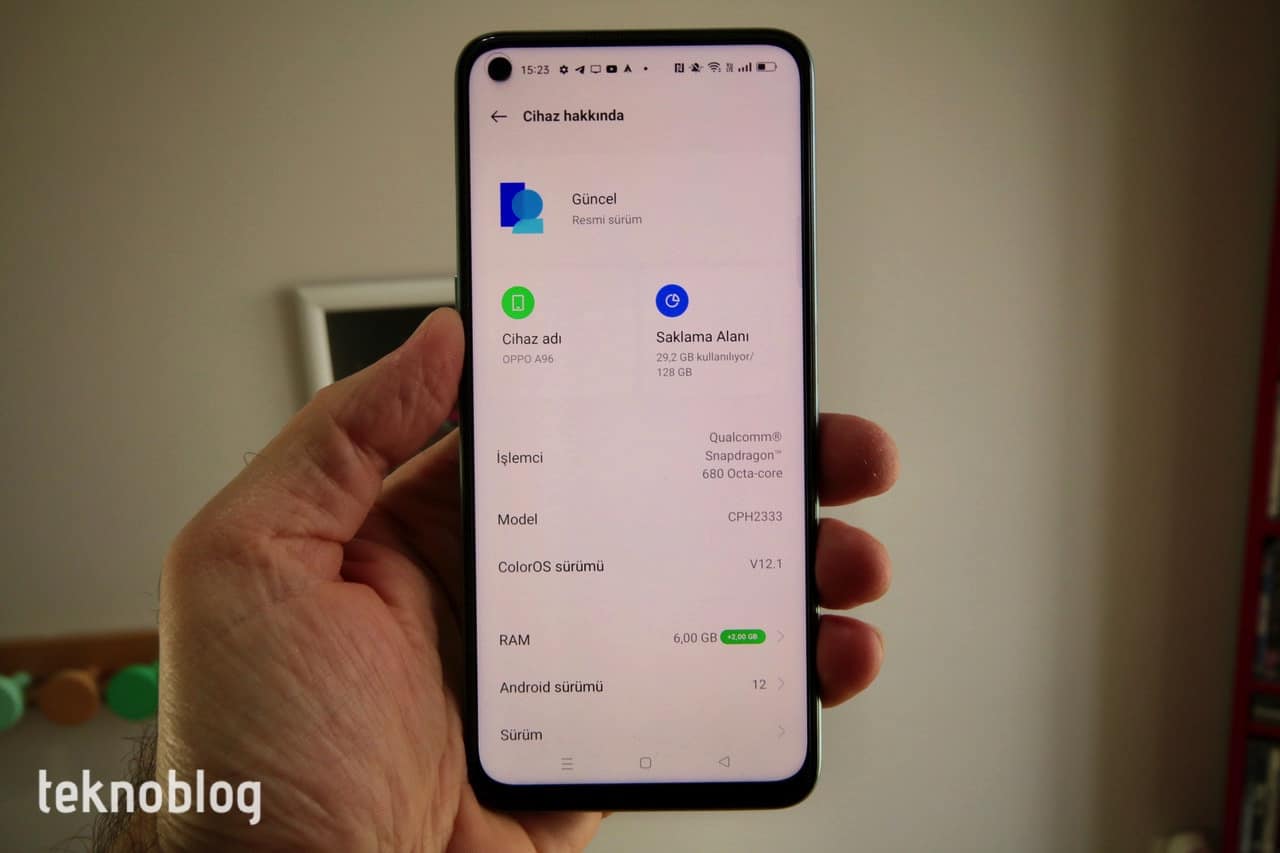 A96’nın kalbinde 4G destekli Snapdragon 680 işlemci var. 6nm tabanlı bu işlemci dört adet 2.4 GHz performans çekirdeği ve dört adet 1.9 GHz verimlilik çekirdeği barındırıyor. Türkiye’de satılan modelde 6 GB RAM ve 128 GB dahili hafıza var. microSD kart yuvası ile depolama alanını daha artırabilirsiniz. Bu arada Oppo, RAM genişletme özelliği sayesinde RAM’i 5 GB’ye kadar artırma imkanı veriyor. Böylelikle çoklu görev tarafında performansı artırmak, aynı anda daha fazla uygulamayı arka planda aktif tutup birden fazla uygulama arasında geçişi, uygulamaların herhangi birindeki işleri kaybetmeden yapmak mümkün hâle gelecektir.