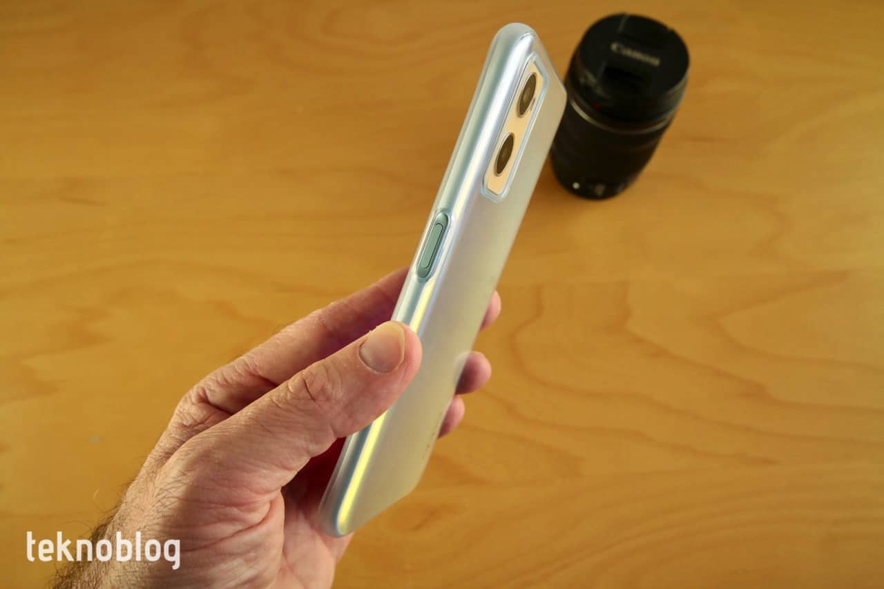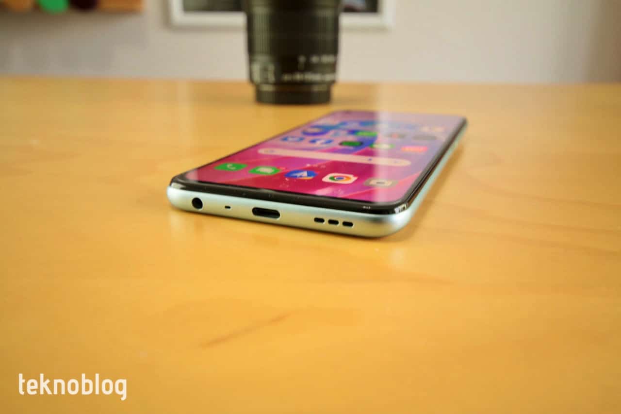 Alt kenarda USB-C portu, hoparlör, mikrofon ve 3.5mm kulaklık jakı var. Sol kenarda ise ses tuşları bulunuyor. Tuşlar dışa doğru çok çıkıntı yapmasa da derinlik yeterli. Karşı kenarda ise, daha sığ olan, yine de rahatlıkla kullanılan güç düğmesi var. Buraya parmak izi okuyucu da eklenmiş. Solda, ses tuşlarının hemen üstünde ise microSD ve nano SIM kart tepsisi var. Bu telefon çift hat destekli ve tepside iki tane SIM kart yuvası bulunuyor. Üst kenarda ise ikinci mikrofon bulunuyor.