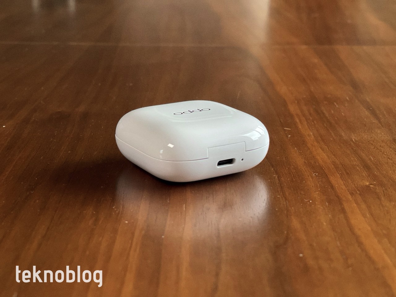 Şarj kutusuna gelirsek, kare şekilli ve kenarları da kavisli bir kutu karşımızda. Bunun dışı parlak ve pürüzsüz bir kaplamaya sahip. Bir istiridye kabuğu gibi ortasından yukarı doğru açılıyor ve kulaklıklar ortaya çıkıyor. Kulaklıklar boyutlarına uygun şekilde açılmış yuvalara yatay biçimde yerleştirilmiş ve her biri yerinden kolaylıkla çıkarılabiliyor. Bu ikisinin ortasında bir fiziksel tuş ve şarj durum gösterge lambası bulunuyor. Arkada ise USB-C portu ve kasanın şarj durumunu gösteren ikinci bir şarj durum lambası yer alıyor. Bu arada şarj demişken, kutunun Qi kablosuz şarj desteğine sahip olduğunu belirtelim.