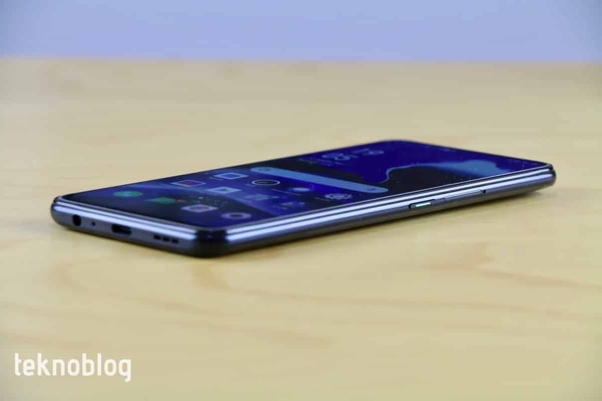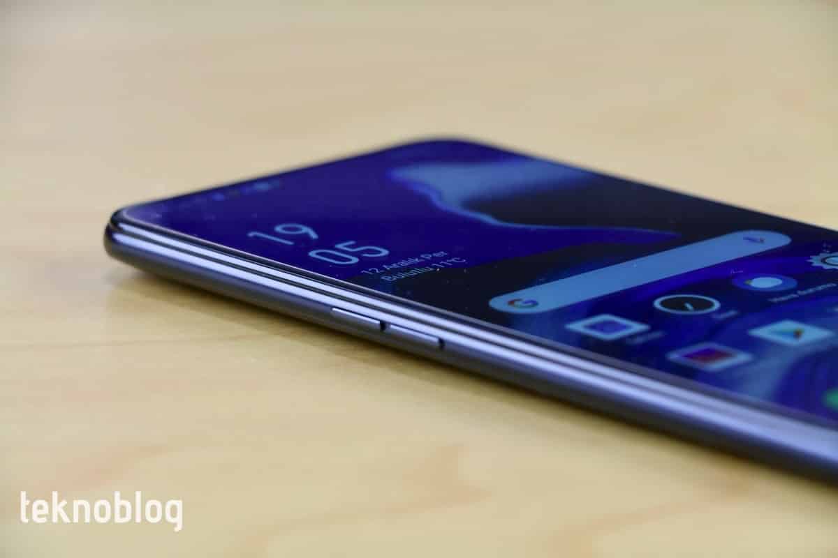 Reno 2Z’nin tek bir hoparlörü var ve o da alt kenarda yer alıyor. Burada USB-C portu, mikrofon ve 3.5mm kulaklık jakı bulunuyor. Üst kenarda açılır selfie kameranın yanında ikinci mikrofon mevcut. Ses tuşları sol kenarda ve biraz daha ortaya doğru yerleştirilmiş. Belki biraz daha üstte olsa iyi olabilirdi. Güç düğmesi ise sağ kenarda ve o da aynı şekilde neredeyse tam ortaya yerleştirilmiş. Güç düğmesinin üstünde yeşil renkli küçük bir çizgi var, bu sayede ayırt edebilirsiniz. Tuşların derinlikleri iyi ve rahatlıkla basılıyor. Bu arada sağ kenarda, düğmenin hemen üstünde nanoSIM ve microSD kart yuvalarını görüyoruz.