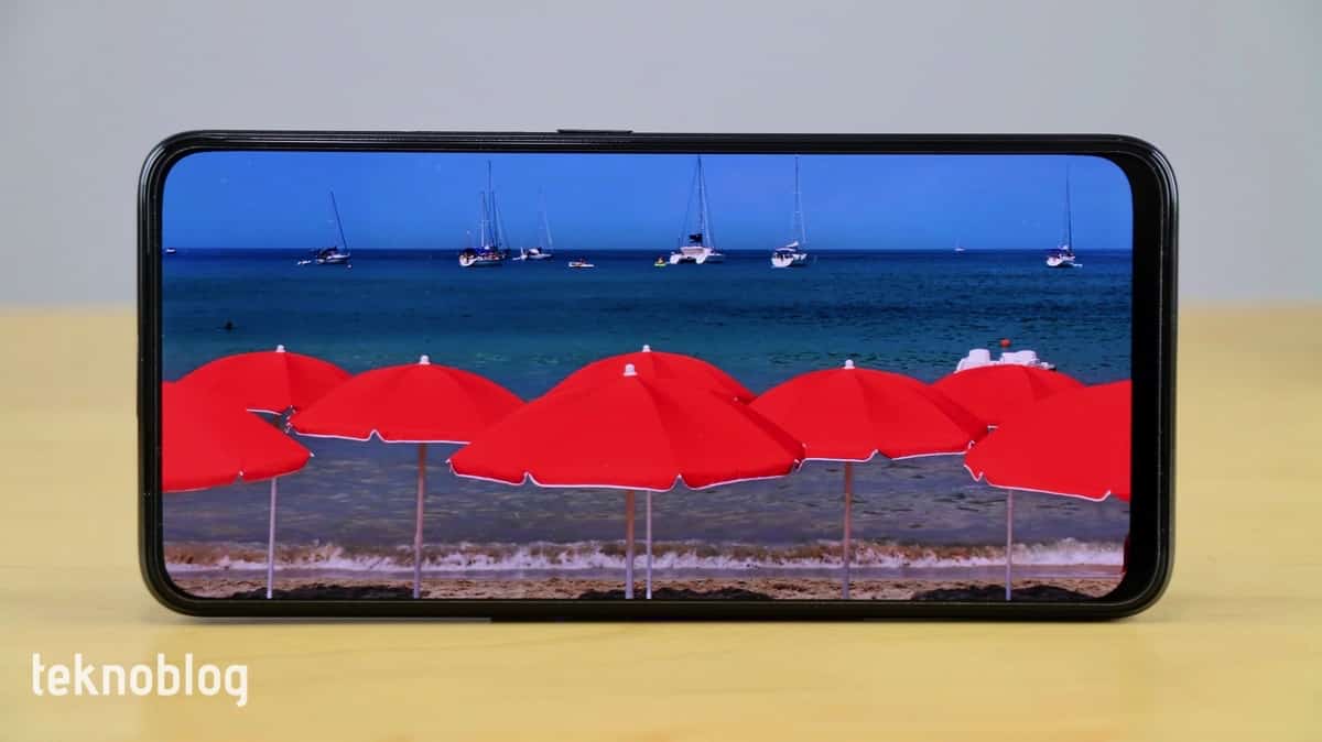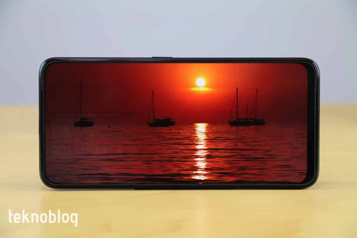6.53 inç ekran telefonun ön yüzünün büyük bir kısmını kaplıyor. Yüzde 85’lik ekran-gövde oranı epey yüksek. Uzun kenarlarda ve üst kenarda epey sınırlara doğru yayılan ekran, sadece alt kısımda ince bir çerçeveye izin veriyor. Ahize hoparlörü ekranın üstünde, ince ve uzun bir ızgara içinde bulunuyor. Normalde bunu ayırt etmek oldukça zor.