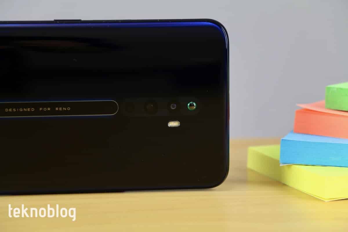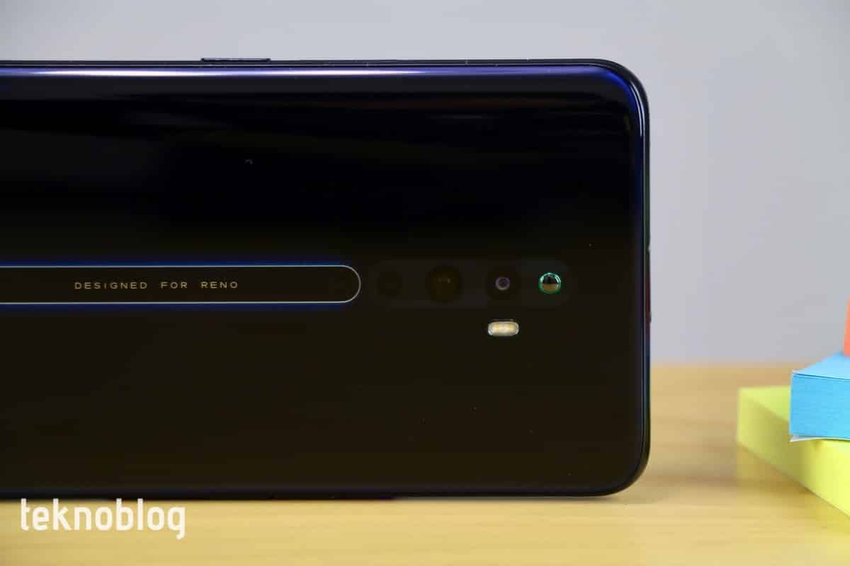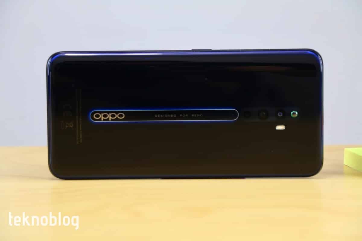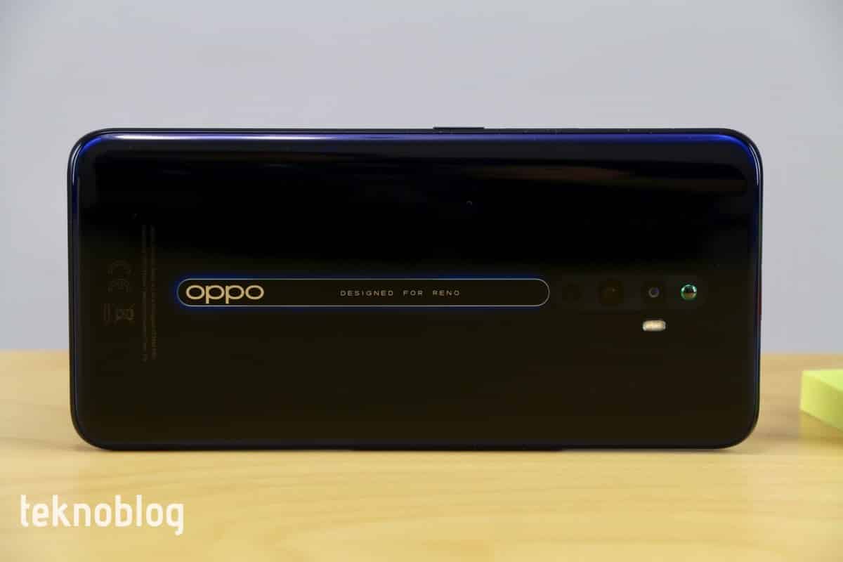 Arka tasarım Oppo Reno 2’ninkine benziyor. İnce ve uzun bir elips şekli ışıldayan görünüm oluşturuyor. Eğer telefonu ışığa doğru tutup yavaşça hareket ettirirseniz, yansımanın bu elips üzerinde etkileyici biçimde hareket ettiğini göreceksiniz. Dört arka kamera, telefonun ortaya doğru kalınlaşan yapısı sayesinde dışa doğru çıkıntı yapmadan duruyor. Oppo, bu kameraların telefon masaya veya herhangi bir yüzeye konulduğunda çizilmesini engellemek için küçük bir yarım küre şekili camı çıkıntı olarak telefonun arkasına eklemiş. Dörtlü kamera grubunun altında çift LED flaşı görüyoruz.