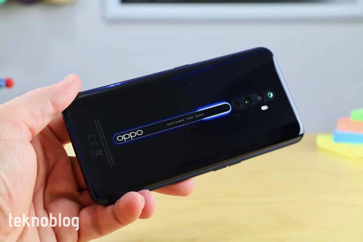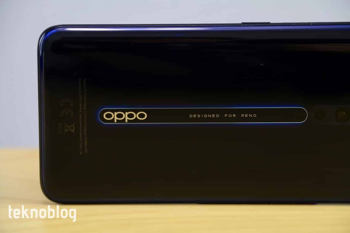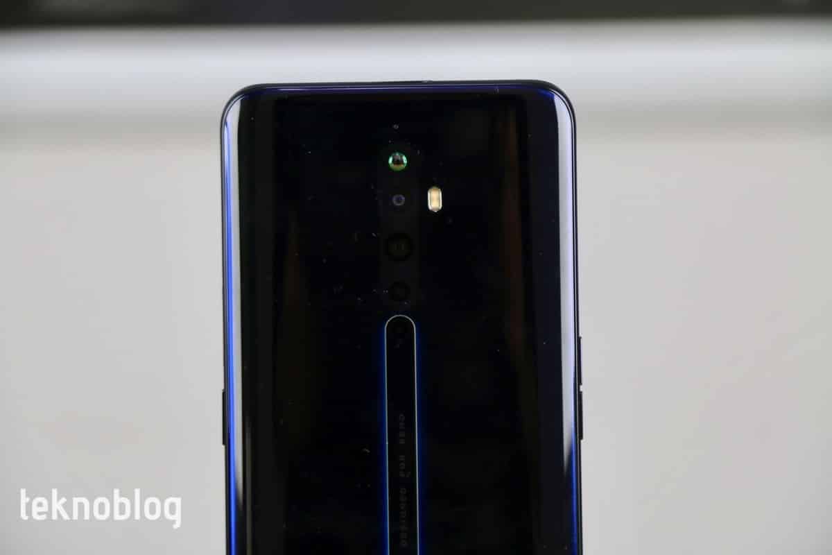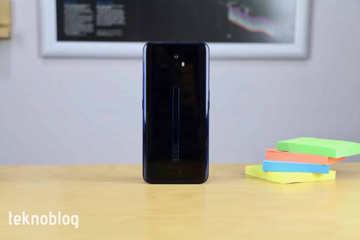 Arka tasarım Oppo Reno 2’ninkine benziyor. İnce ve uzun bir elips şekli ışıldayan görünüm oluşturuyor. Eğer telefonu ışığa doğru tutup yavaşça hareket ettirirseniz, yansımanın bu elips üzerinde etkileyici biçimde hareket ettiğini göreceksiniz. Dört arka kamera, telefonun ortaya doğru kalınlaşan yapısı sayesinde dışa doğru çıkıntı yapmadan duruyor. Oppo, bu kameraların telefon masaya veya herhangi bir yüzeye konulduğunda çizilmesini engellemek için küçük bir yarım küre şekili camı çıkıntı olarak telefonun arkasına eklemiş. Dörtlü kamera grubunun altında çift LED flaşı görüyoruz.