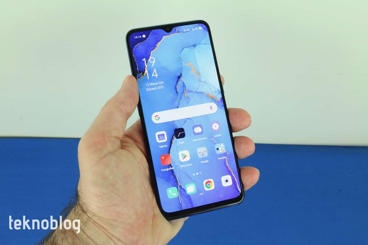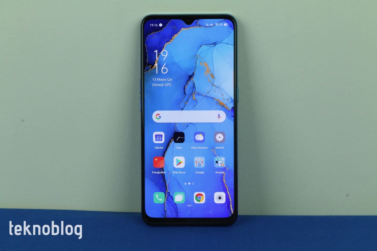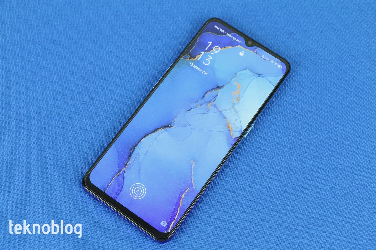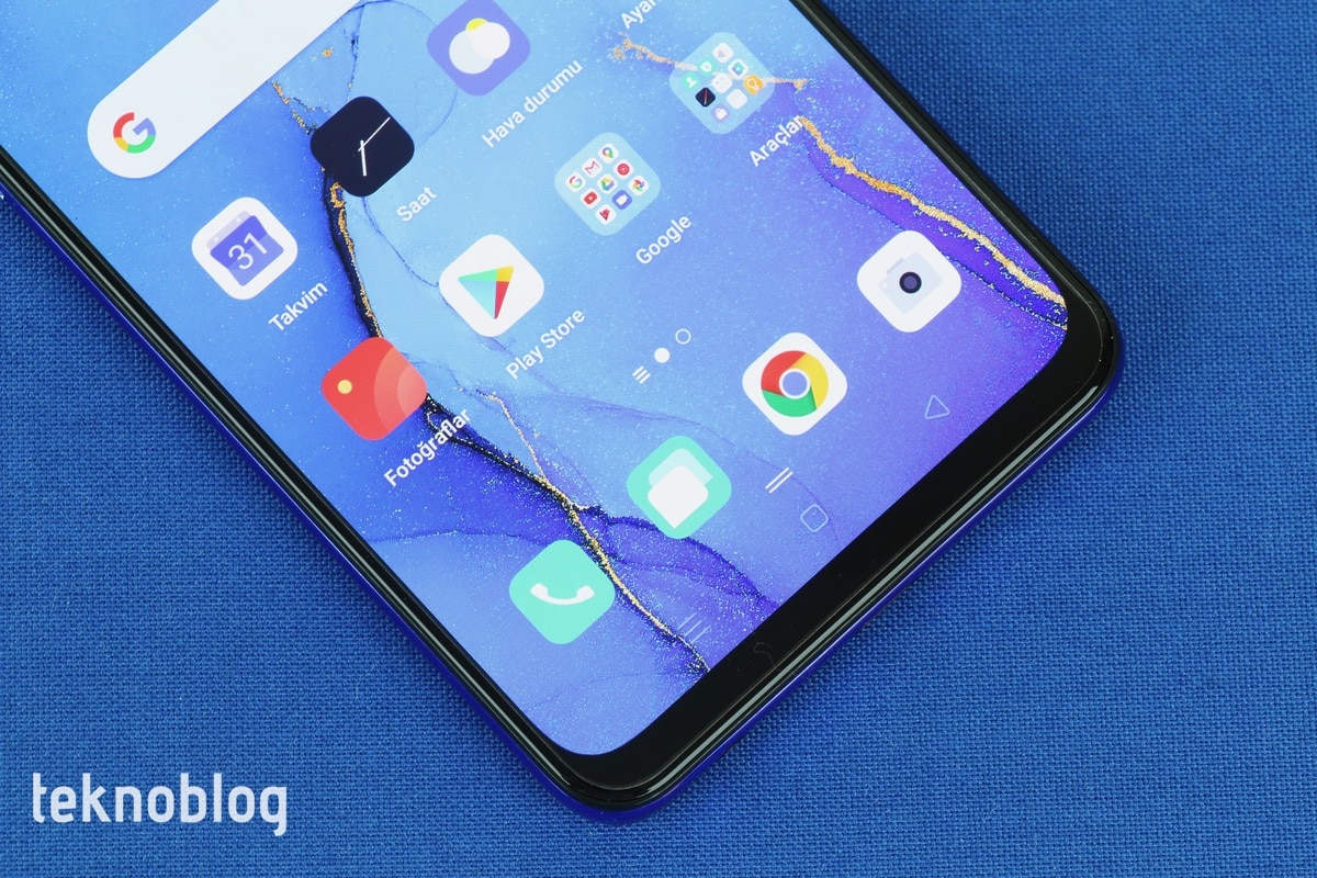 Oppo Reno 3’ün önünde teknik detaylarına daha sonra değineceğimiz 6.4 inç büyüklüğünde bir ekran bulunuyor. Telefonun ön panelinin yüzde 84.2’lik kısmını kaplayan ekranın üstünde daha önce belirttiğimiz gibi, ön kameraya ev sahipliği yapan bir damla çentik bulunuyor. Bu ekranı ince bir çerçeve sarıyor. Söz konusu çerçeve, alt kenara inildiğinde biraz daha kalınlaşılıyor. Çerçeveyle damla çentiğin buluştuğu noktaya telefonun ahize hoparlörü de ustalıkla gizlenmiş.