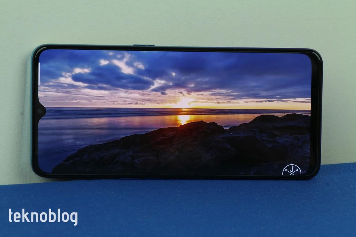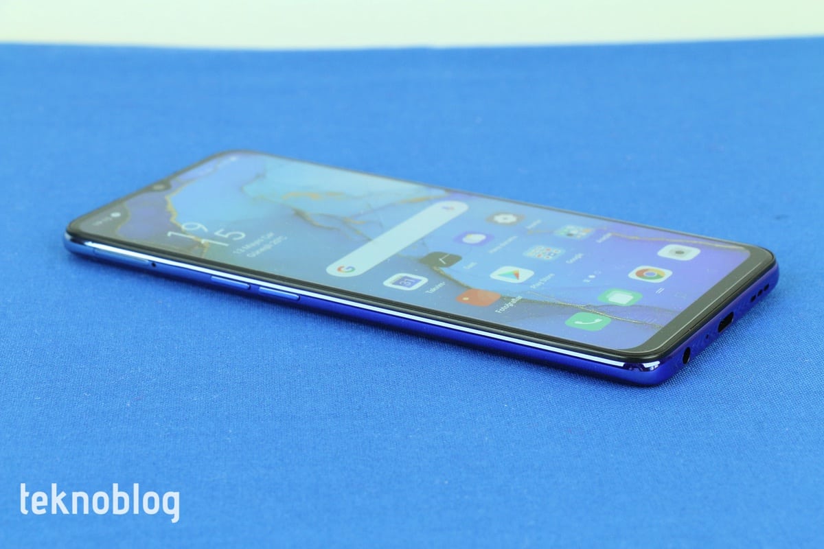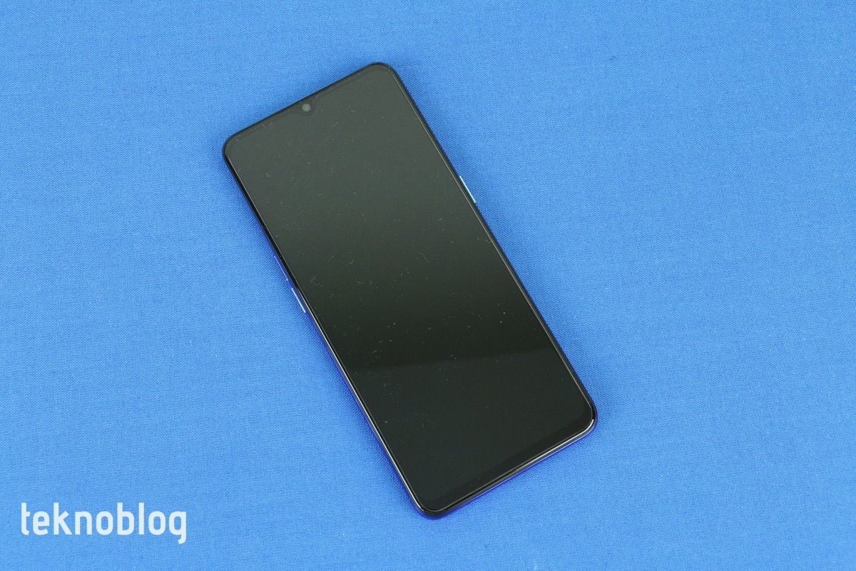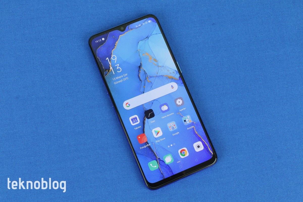 Oppo Reno 3’ün önünde teknik detaylarına daha sonra değineceğimiz 6.4 inç büyüklüğünde bir ekran bulunuyor. Telefonun ön panelinin yüzde 84.2’lik kısmını kaplayan ekranın üstünde daha önce belirttiğimiz gibi, ön kameraya ev sahipliği yapan bir damla çentik bulunuyor. Bu ekranı ince bir çerçeve sarıyor. Söz konusu çerçeve, alt kenara inildiğinde biraz daha kalınlaşılıyor. Çerçeveyle damla çentiğin buluştuğu noktaya telefonun ahize hoparlörü de ustalıkla gizlenmiş.