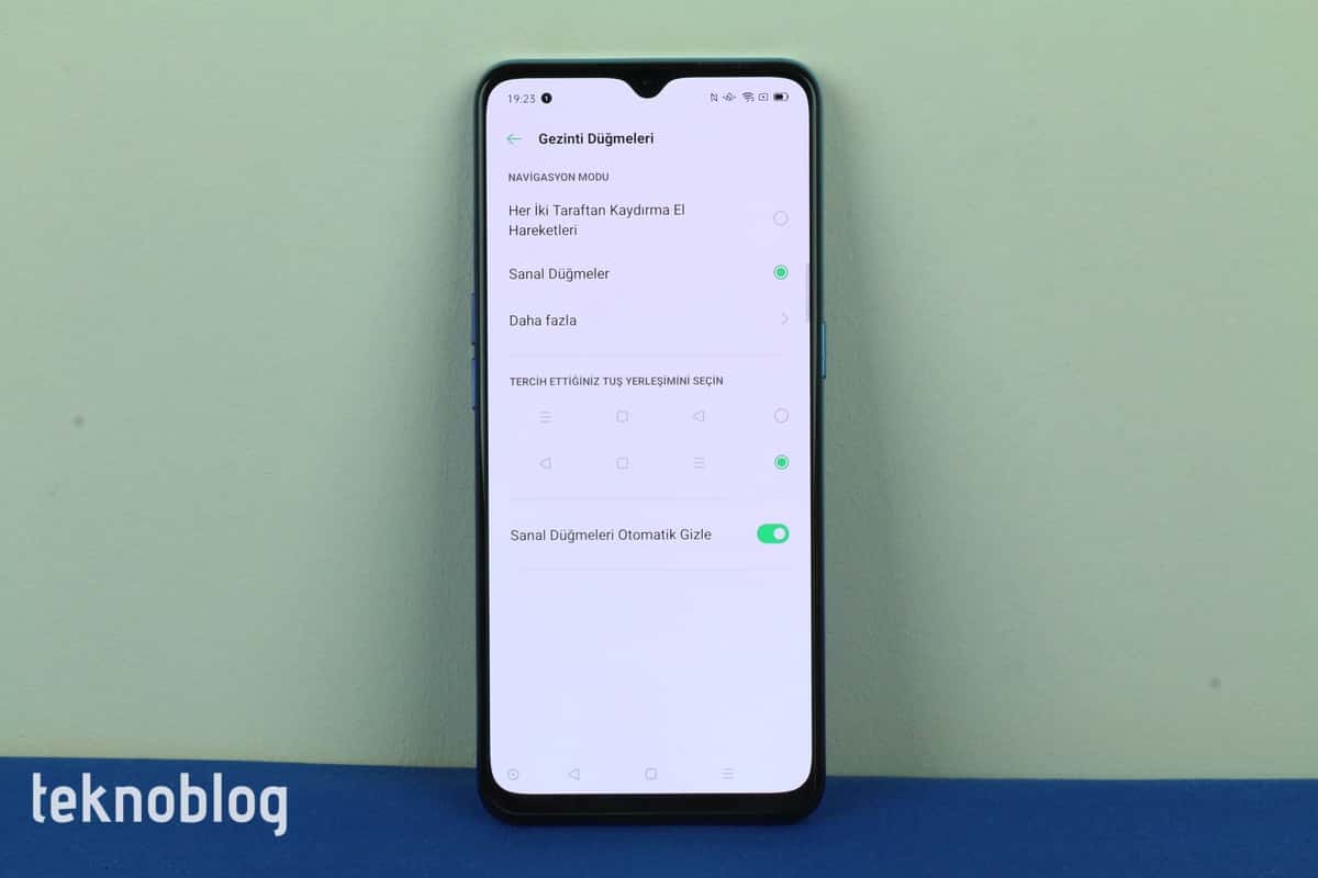 Reno 3’ün arka panelinde de ışığa göre değişen bir renk işçiliği uygulanmış. Test merkezimize gelen “Kuzey Işıkları” olarak adlandırılan renk seçeneğinde de mavinin farklı tonlarını görmek mümkün oluyor. Telefonun ön ve arka panellerini birleştiren çerçevenin plastik olması ise cam arka panelin ve diğer tasarım tercihlerinin yarattığı “üst sınıf etkisi”ni aşağıya çekiyor.