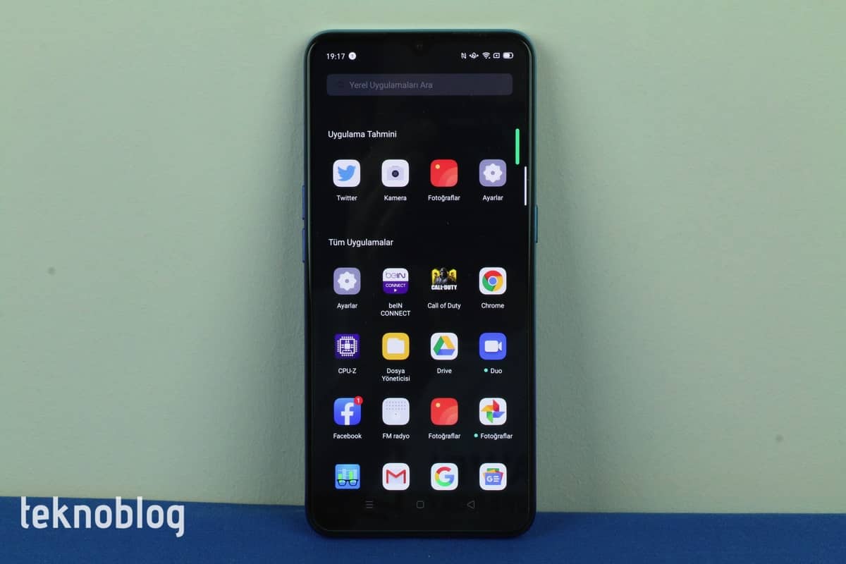 Oppo Reno 3’te ana ekranda yukarıya doğru sürükleme yapıldığında kullanıcıların karşısına uygulama çekmecesi çıkıyor. Bu çekmecede uygulamalar alfabetik şekilde sıralanıyor. Ancak en üst sırada yakın zamanda kullanılan veya yüklenen uygulamalar, “Uygulama Tahmini” başlığı altında gruplanıyor. Çekmecenin en üstündeki arama çubuğu da kullanıcıların aradıkları uygulamayı bulmalarını kolaylaştırıyor.