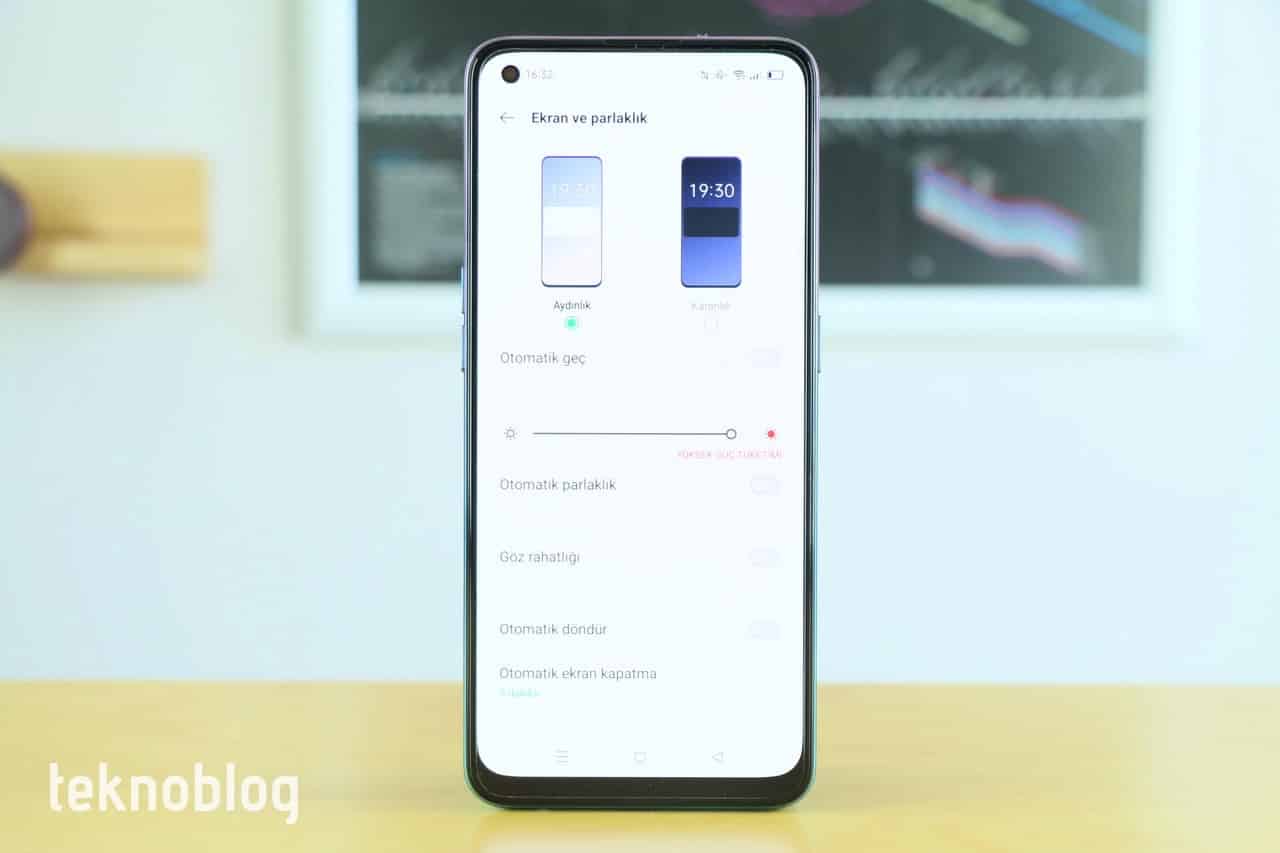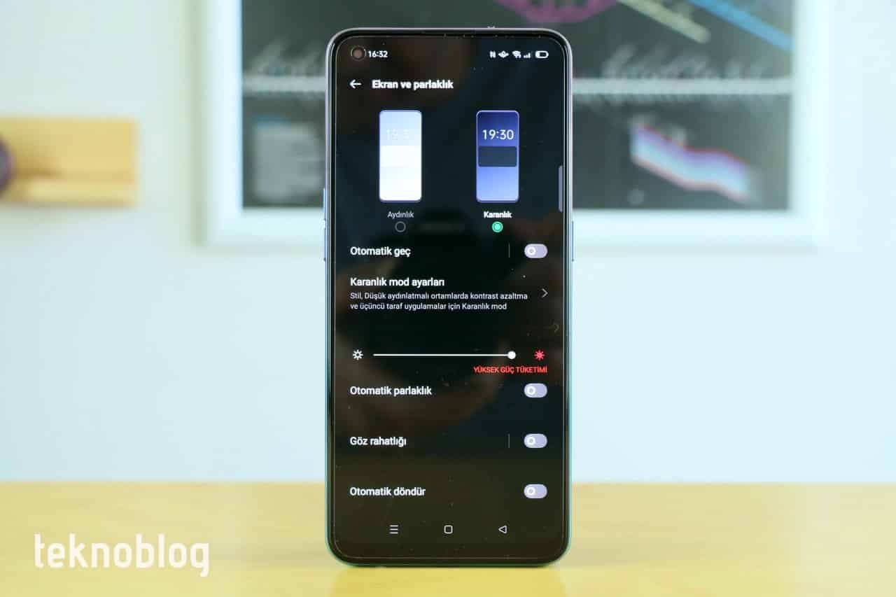 Mavi ışık filtresi otomatik olarak çalıştırılabilen telefonda ekranın renk sıcaklığı da kullanıcının tercihine uygun şekilde ayarlanabiliyor. Kullanıcılar koyu renk modunu da ekran ayarları üzerinden aktif hâle getirebiliyor.