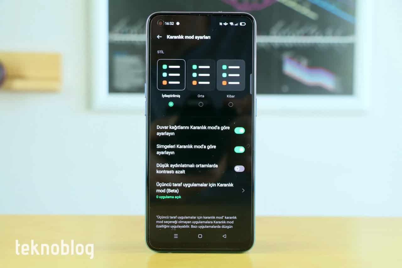 ColorOS 11 ile kullanıcılara karanlık modu da kişiselleştirme imkanı veriliyor. Burada stil bölümü üzerinden karanlık modun yoğunluğu seçilebiliyor. Ancak bu ayarları görmek için öncelikle karanlık modu aktif hâle getirmek gerekiyor. Karanlık modun yoğunluğu konusunda iyileştirilmiş, orta ve kibar olmak üzere üç renk seçeneği sunuluyor. Bu modlar kullanıcıları derin siyahlardan koyu grilere doğru götürüyor. Söz konusu özelliğin karanlıkta okuma yaparken işe yaradığı söylenebilir.