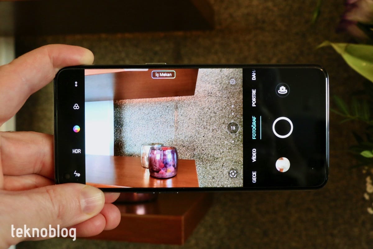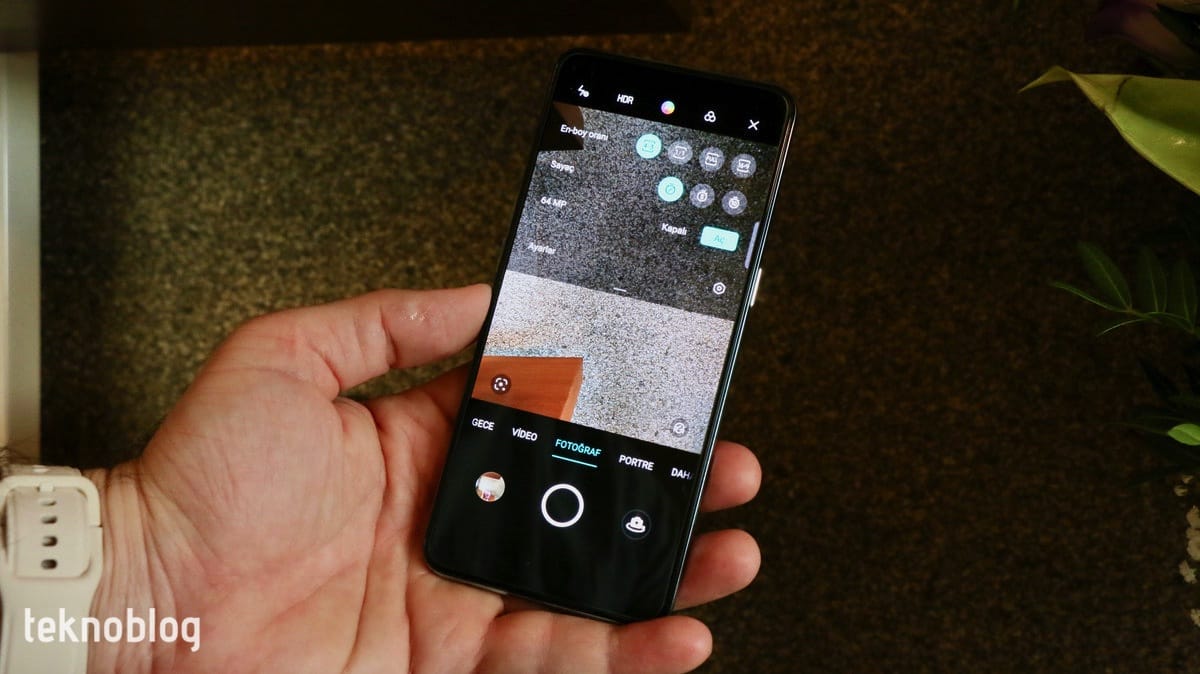 Kamera uygulaması, kolay kullanımıyla dikkat çekiyor. Ekranın bir kenarında çekim tuşu, kamera değiştirici ve çekim modu sürgüsü bulunuyor. Diğer kenarda ise filtreler, HDR, flaş ve yapay zekâ düğmesi var. Parmağınızı çekerek en-boy oranı, sayaç, 64 MP ve diğer kamera ayarlarına erişebilirsiniz.