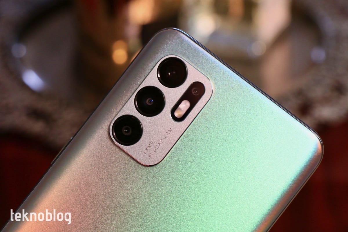 Kamera modülü sol üst köşeye yerleştirilmiş. Reno 5’teki gibi yuvarlatılmış köşeli bir dikdörtgen şekil üstüne dört tane kamera yerleştirilmiş. Bu sefer çift LED flaş var ve dördüncü kamera ile bunun yan yana yerleştirildiğini görüyoruz. Bu açıdan Reno 5’in kamera modülünden ayrılıyor. Yine, telefon yatay yönde tutulup fotoğraf çekildiğinde bir basçek makine görünümü hissettirecek biçimde Oppo logosu ve kamera modülünün üzerindeki yazılar yatay eksende yerleştirilmiş.