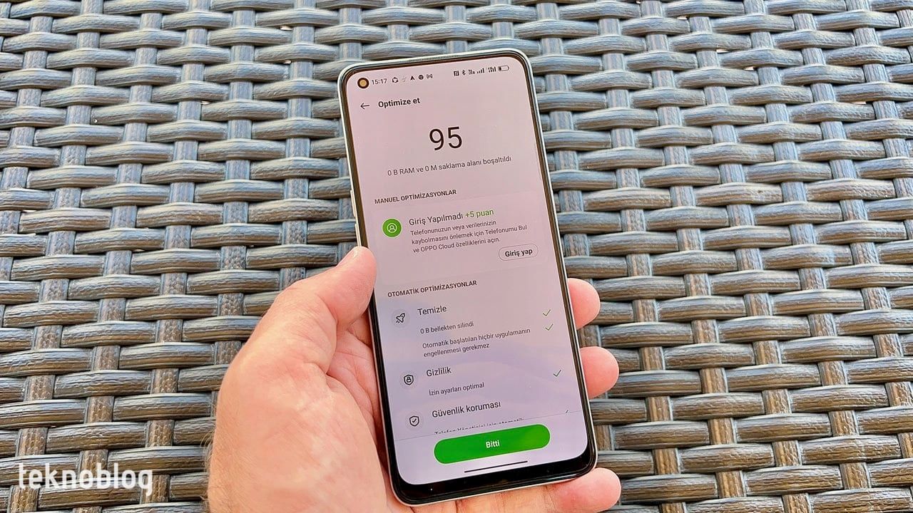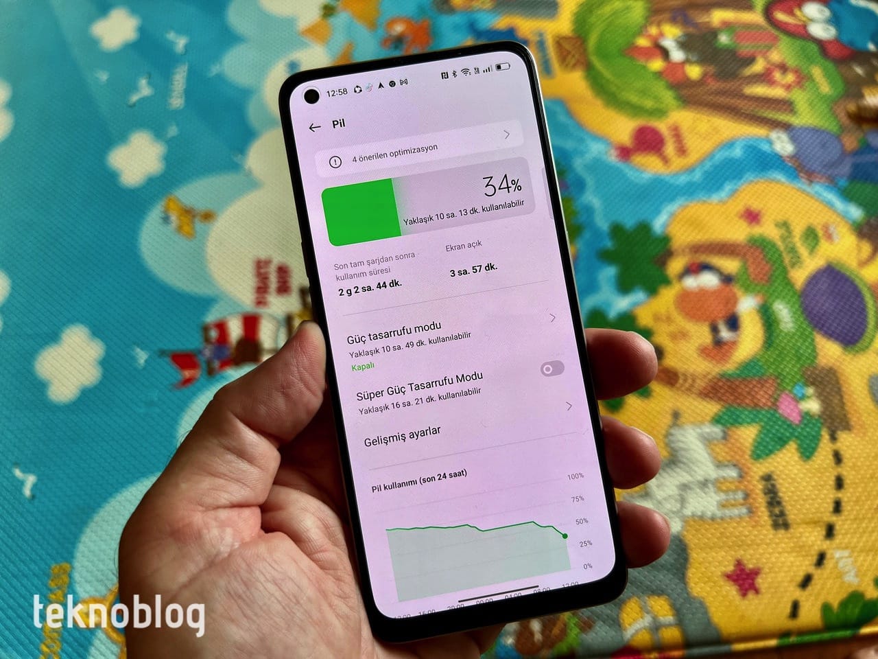 Reno 7’de 4500 mAh kapasiteli pil var. Bu gövdeye göre iyi kapasitede bir pilin olduğunu söyleyebiliriz. Normal yoğunluklu kullanımda iki güne varan bir çalışma süresi elde edebilirsiniz. Biz Reno 7’yi ekranı 5 buçuk saat boyunca açık tutarak iki buçuk gün boyunca kullanmayı başardık. Bu, gerçekten etkileyici bir performans. Üstelik Oppo, pil optimizasyonu ve tasarrufu tarafında da zengin araçlar sunuyor. Telefonda 33W hızlı şarj desteği var, ancak kutudan şarj adaptörü çıkmıyor. Sadece bir USB-C kablosu var. Eğer daha önce bir Oppo telefonu kullandıysanız, oradan kalan adaptörü kullanabilirsiniz. Aksi takdirde USB-A çıkışlı bir adaptör edinmeniz iyi olur.
