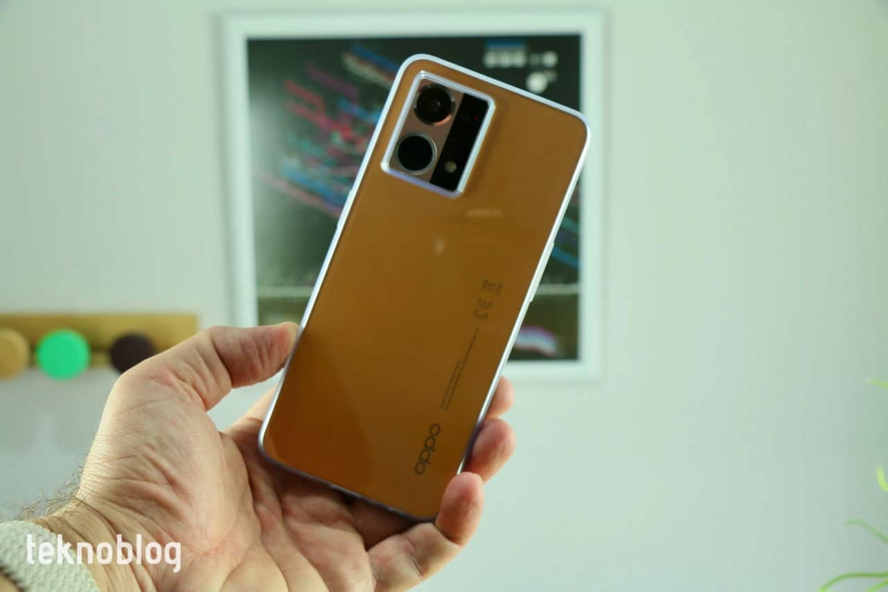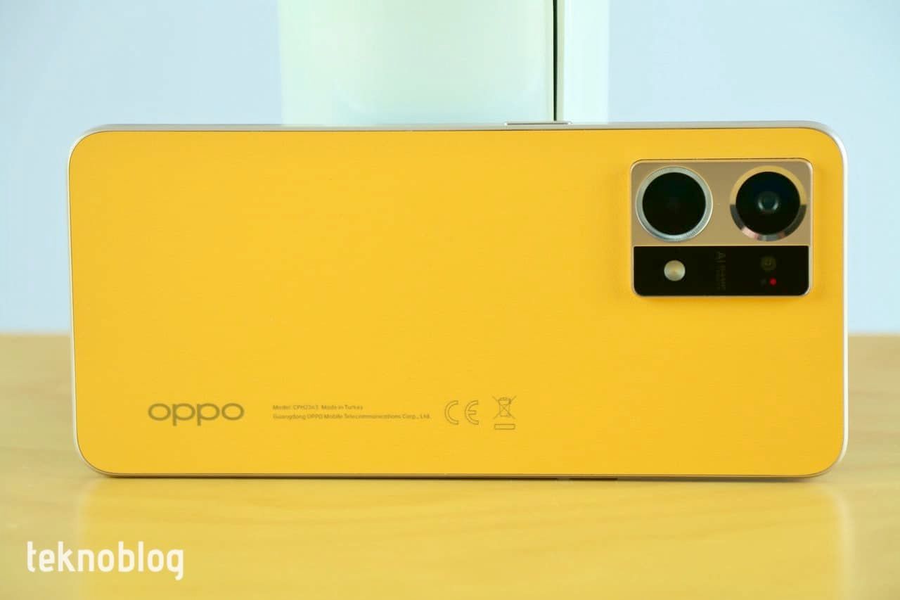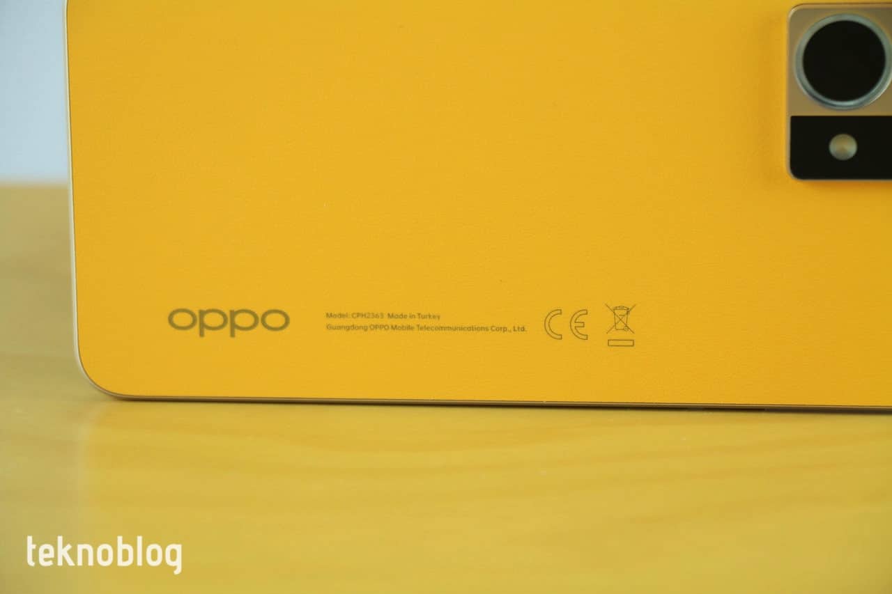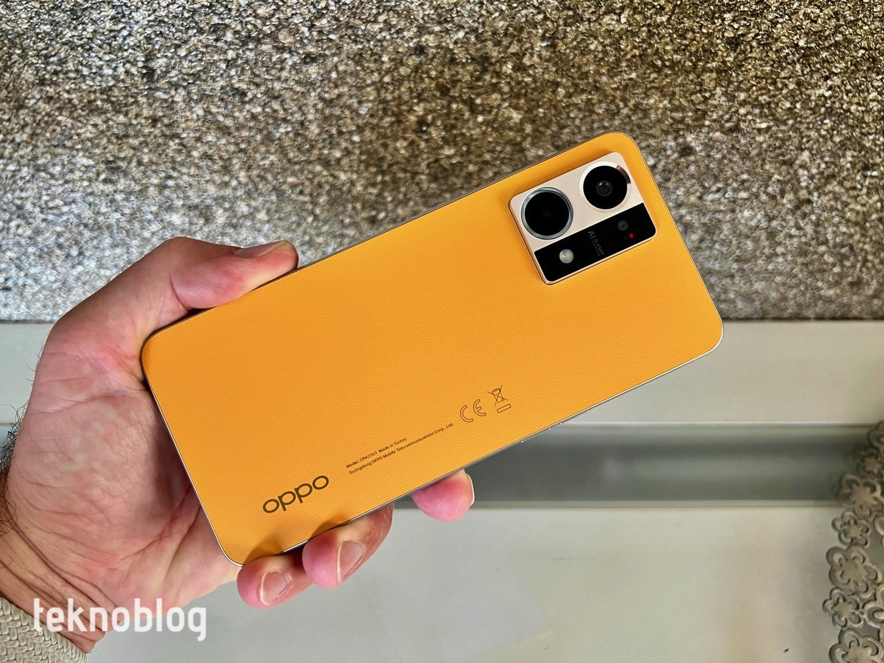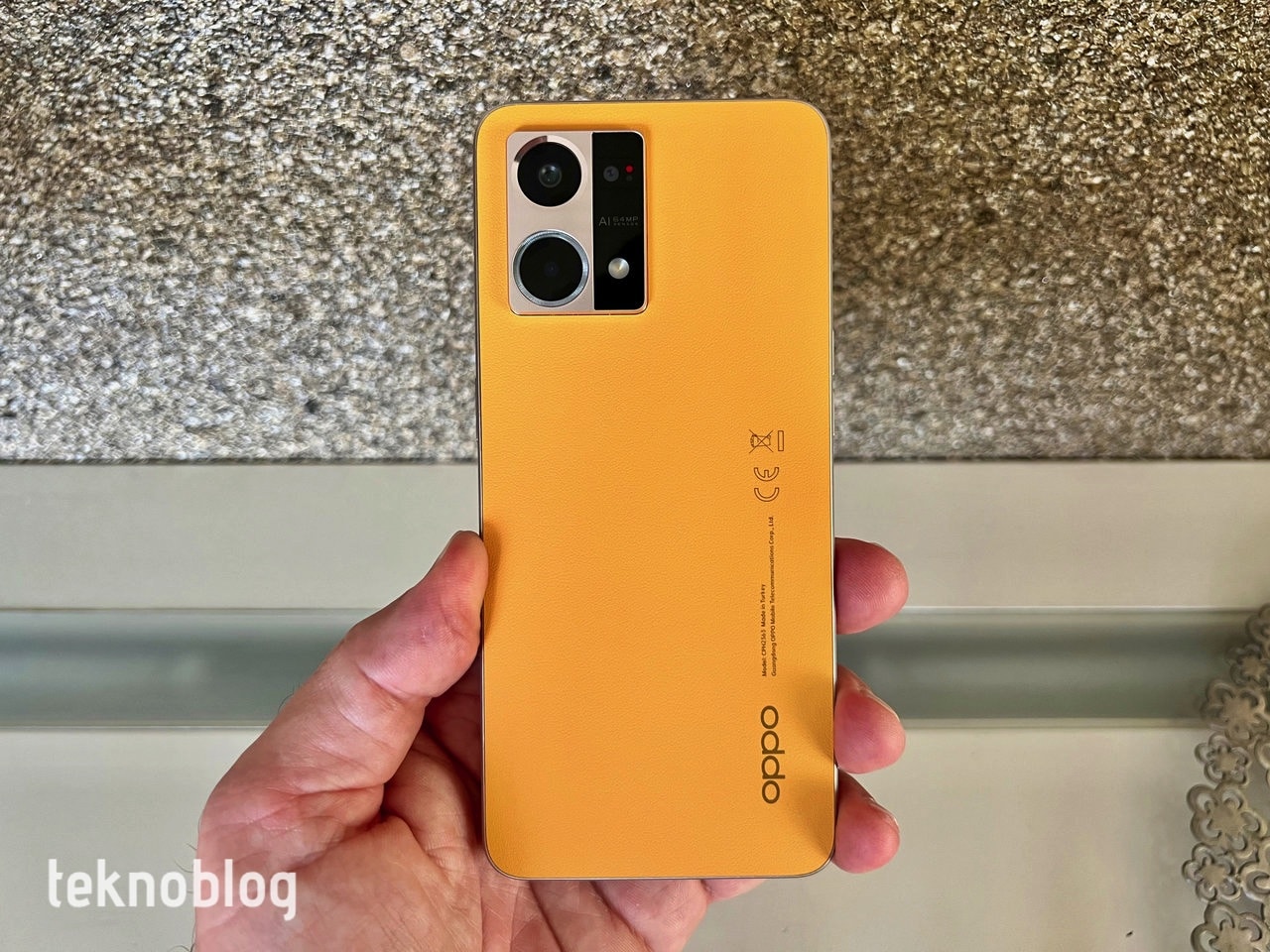 Oppo birkaç nesil sonra Reno serisinin tasarımında radikal bir değişiklik yaptı. Daha önce gördüğümüz kenarlara doğru kavis yapan arka yüz ve yuvarlatılmış kenarların yerini düz kenar ve arka yüz tasarımı alıyor. Önde Corning Gorilla Glass 5 cam kullanılmış. Kenarlar metal görünümlü plastikle çevrelenmiş. Arkada ise fiberglass deri kaplama var. Yumuşak ve pürüzlü yüzeyiyle hoş bir kullanım hissi ve görünüm oluşturuyor. Turuncu renk bir hayli hoş görünüyor. Arka yüzün bu kalite hissi veren görünümünü şık biçimde tasarlanmış ve dışa doğru hafif çıkıntı yapan kamera modülü tamamlıyor. Bu arada, arkadaki “Made in Turkey” ibaresine de dikkat çekmeden geçmeyelim.
