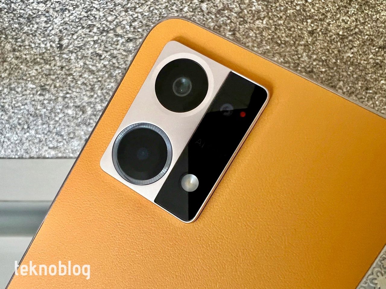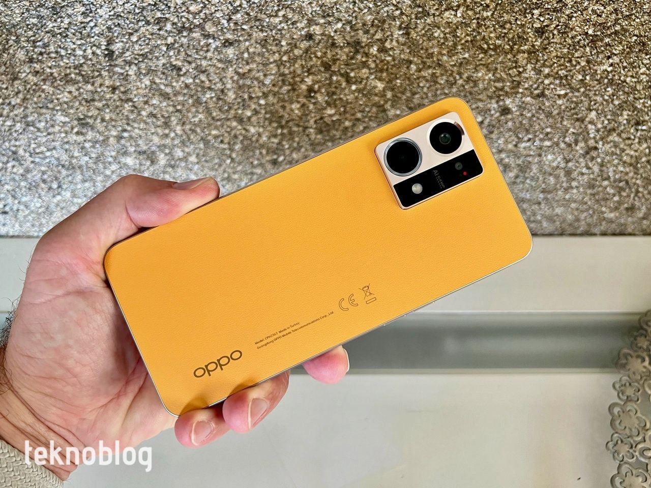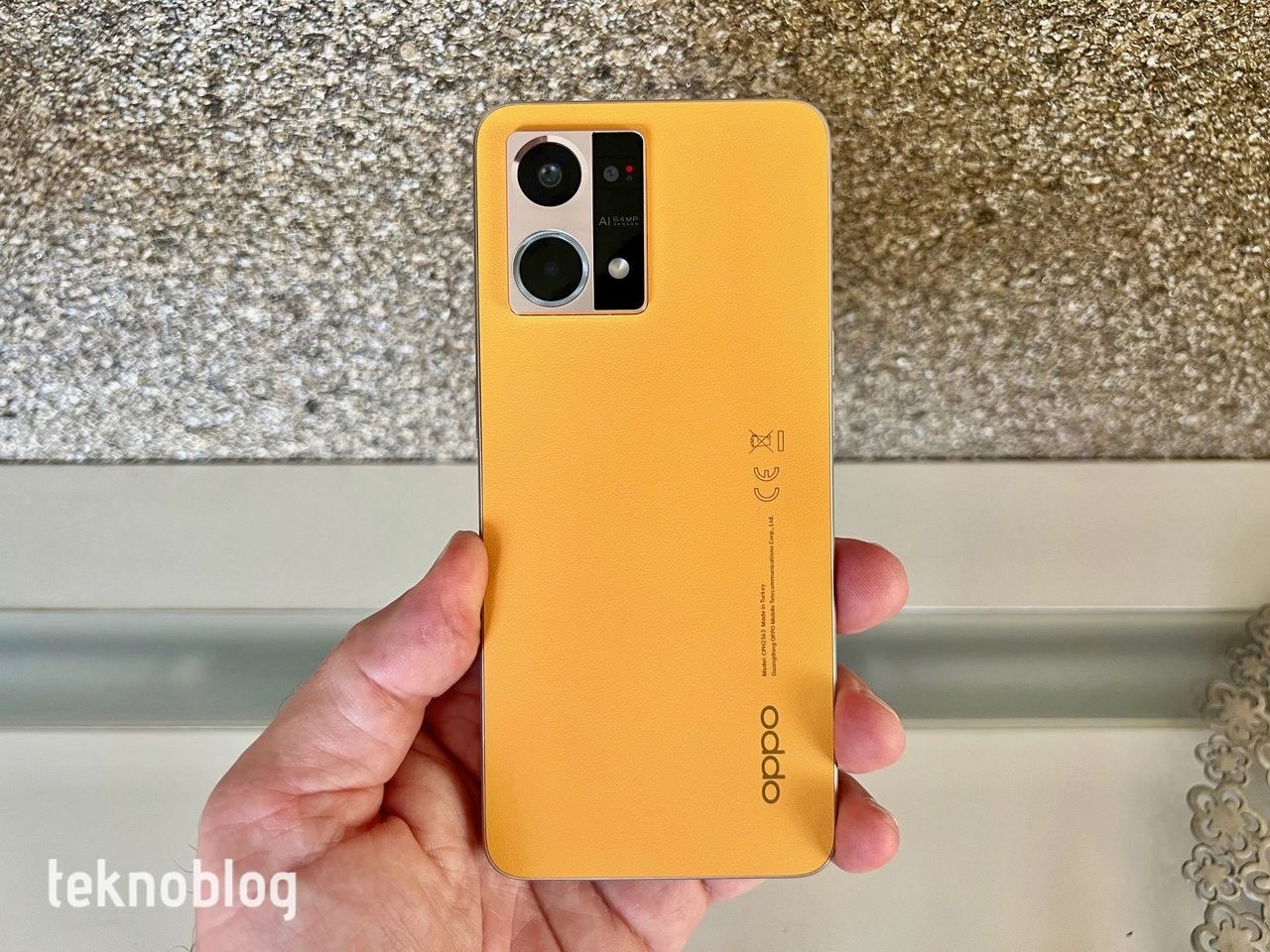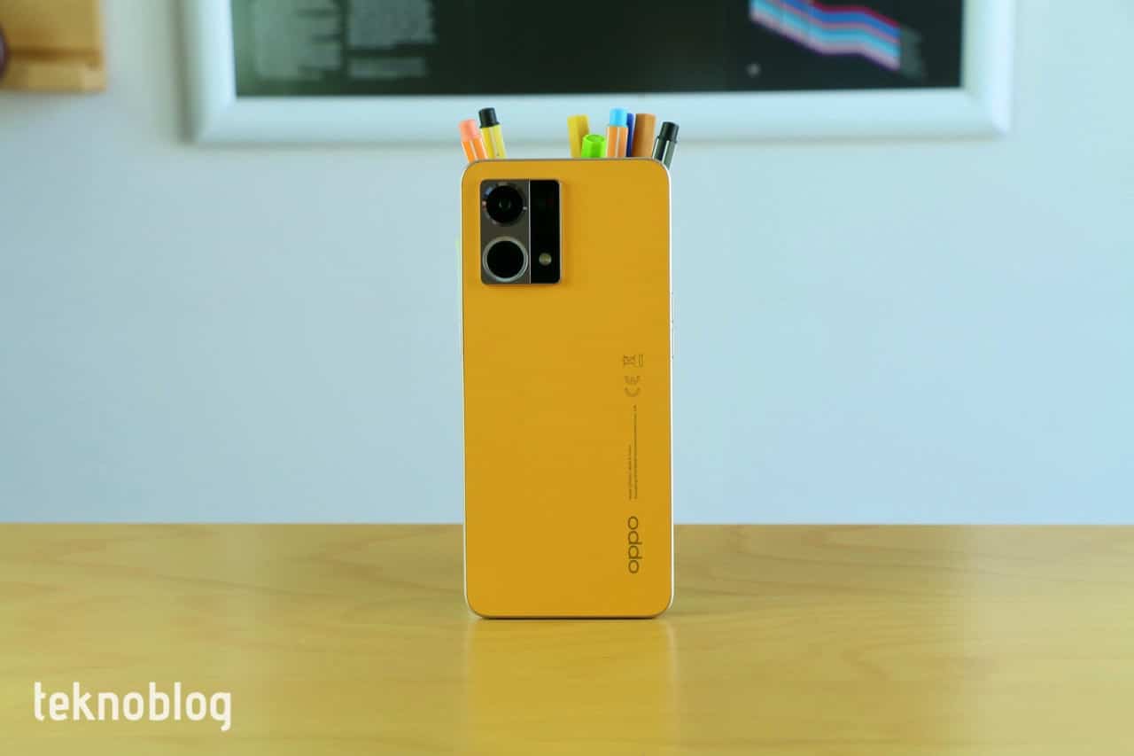 Oppo birkaç nesil sonra Reno serisinin tasarımında radikal bir değişiklik yaptı. Daha önce gördüğümüz kenarlara doğru kavis yapan arka yüz ve yuvarlatılmış kenarların yerini düz kenar ve arka yüz tasarımı alıyor. Önde Corning Gorilla Glass 5 cam kullanılmış. Kenarlar metal görünümlü plastikle çevrelenmiş. Arkada ise fiberglass deri kaplama var. Yumuşak ve pürüzlü yüzeyiyle hoş bir kullanım hissi ve görünüm oluşturuyor. Turuncu renk bir hayli hoş görünüyor. Arka yüzün bu kalite hissi veren görünümünü şık biçimde tasarlanmış ve dışa doğru hafif çıkıntı yapan kamera modülü tamamlıyor. Bu arada, arkadaki “Made in Turkey” ibaresine de dikkat çekmeden geçmeyelim.