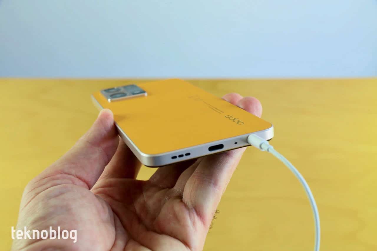 Reno 7’nin sağ kenarında güç butonu var. Sol kenarında ise ses tuşları var. Bu tuşlar sağ veya sol elle tutuşta telefonu avuç içinde hareket ettirmeye gerek olmayacak biçimde konumlandırılmış. Sol kenarda üst tarafa doğru microSD ve nano SIM kart tepsisi var. Alt kenarda USB-C portu, hoparlör, mikrofon ve 3.5mm kulaklık jakı var. Üstte ise ikinci mikrofon bulunuyor.