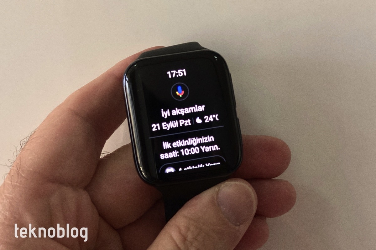 Saat görünümündeyken parmağınızı sağa sürüklediğinizde ise Google Asistan’a erişiyorsunuz. Asistan’ın Türkçe desteği saatin bu özelliğinden gerçek anlamda yararlanmanızı sağlıyor. Hatırlatıcı kurma, hava durumu bilgisi alma ve bunun gibi sorgularınızı veya komutlarınızı saat üzerinden girebilirsiniz. Saat görünümünde sağa doğru sürüklediğinizde ise Google’ın kartlar olarak tanımladığı çeşitli bilgi kartlarına erişiyorsunuz. Burada da egzersiz, hava durumu, vb. çeşitli seçenekler var. Saat görünümü veya kartların ayarlarını bağlı telefondaki Wear OS uygulamasından veya doğrudan saat arayüzünden gerçekleştirebilirsiniz.