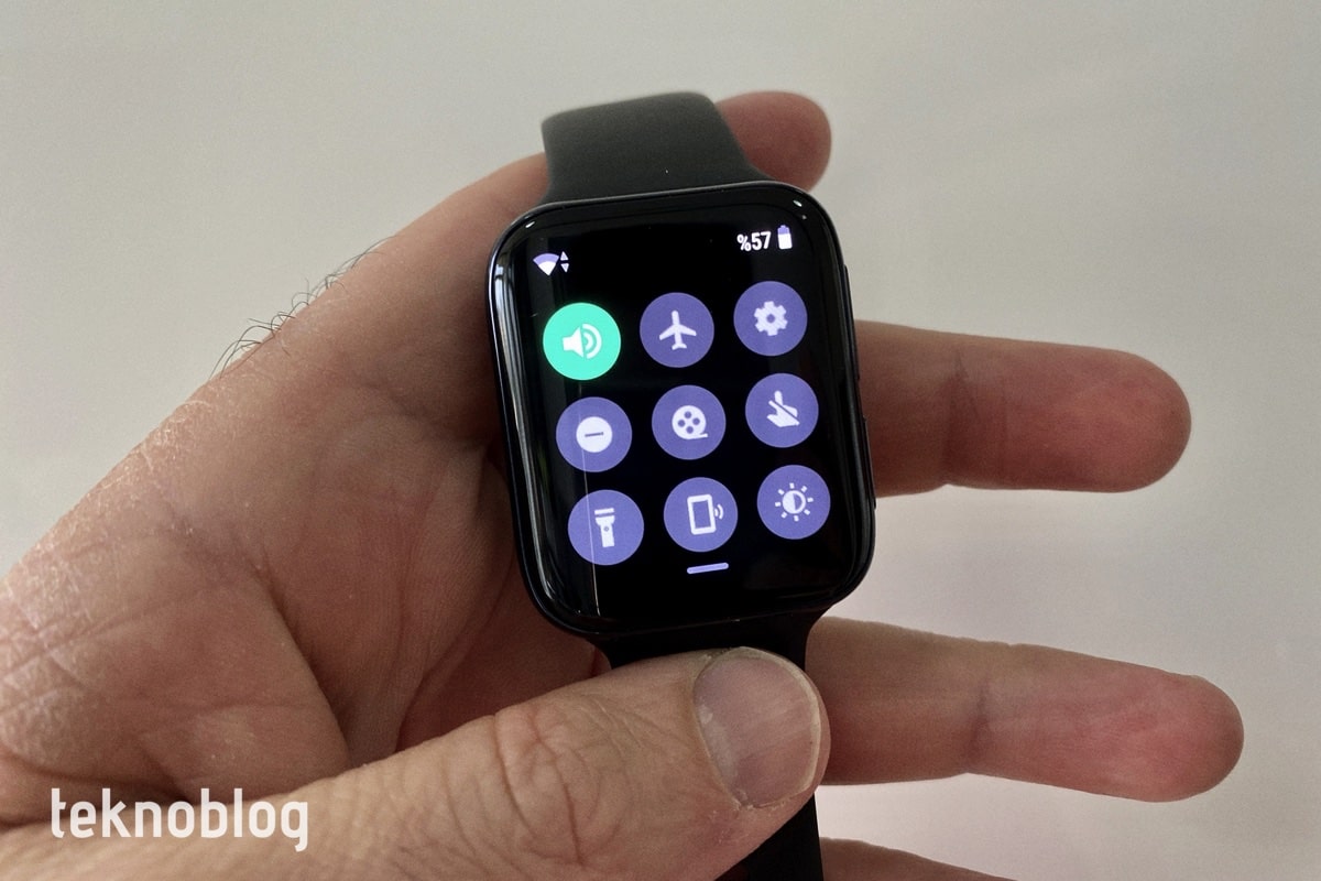 Yine saat görünümündeyken parmağınızı ekranın üst kısmından aşağı sürüklediğinizde de hızlı ayarlar bölümüne erişiyorsunuz. Burada ise saatin olmazsa olmaz ayarları bulunuyor. Sinema modu, el feneri, telefonumu bul, parlaklık kontrolü gibi kontroller burada bulunuyor. Bu kontroller için seçilen simgeler de kolay ve anlaşılır biçimde tasarlanmış.
