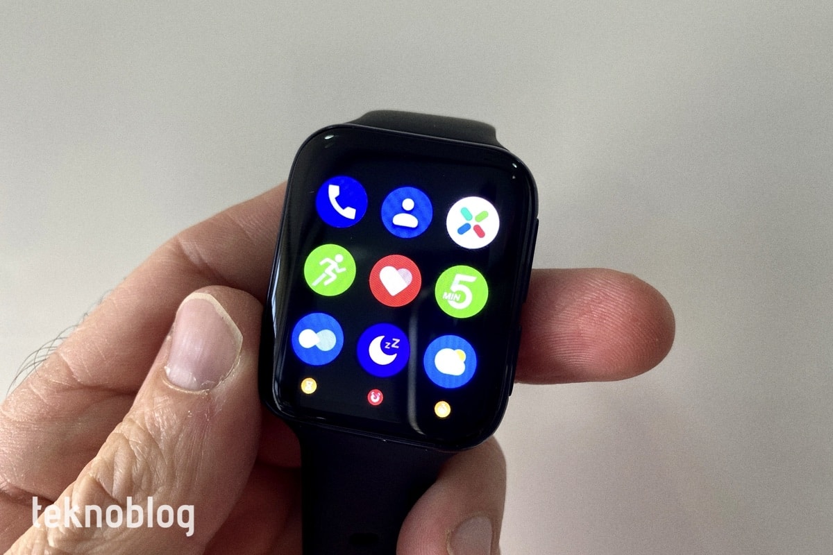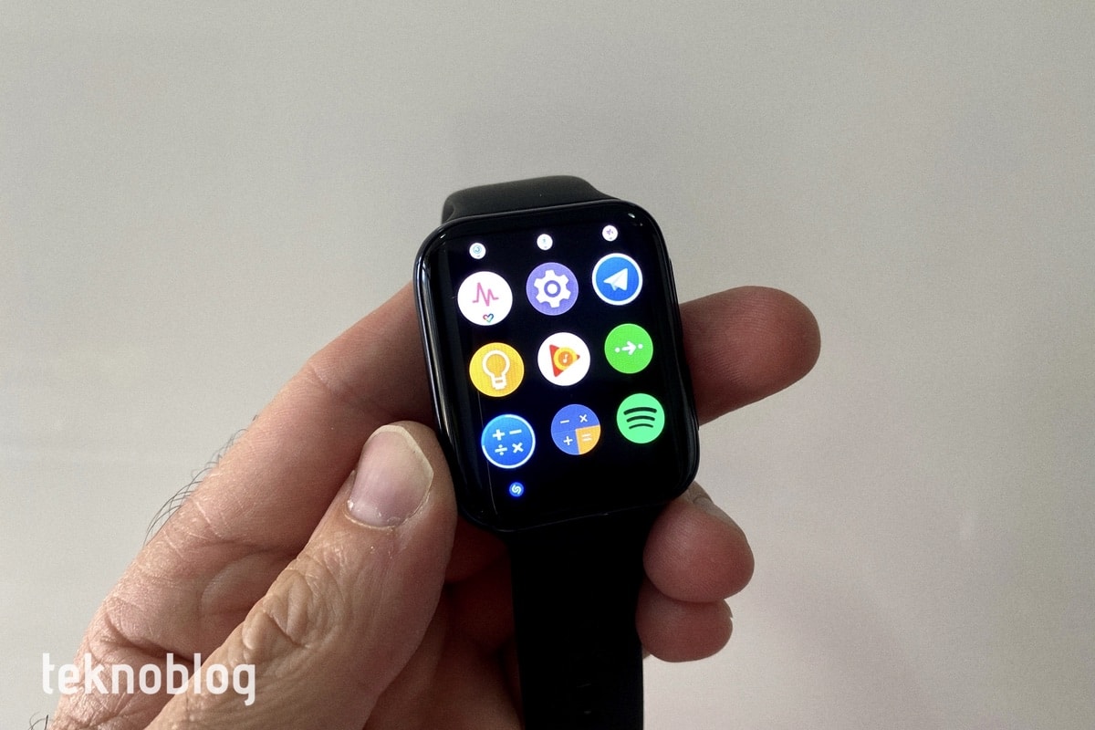 Saat yüzünde ekranın altından ortasına doğru sürüklediğinizde eriştiğiniz bildirim paneli Oppo’nun akıllı telefonlarındaki renk düzenini ve yazı tiplerini içeriyor. Saatin sağında bulunan üst düğmeye bastığınızda erişeceğiniz uygulama menüsünün görünümü için de benzer bir yorum yapılabilir. Uygulamaların liste şeklinde görüntülenmesi yerine simgelerinin 3 x 3’lük matris biçiminde sıralandığı bir menü tasarımı görüyoruz. Altlarında isimleri olmadığı için ne olduklarını anlamakta zorlanmanız çok düşük ihtimal, çünkü şekiller hangi uygulamaya ait olduklarını rahatlıkla anlamanızı sağlıyor.