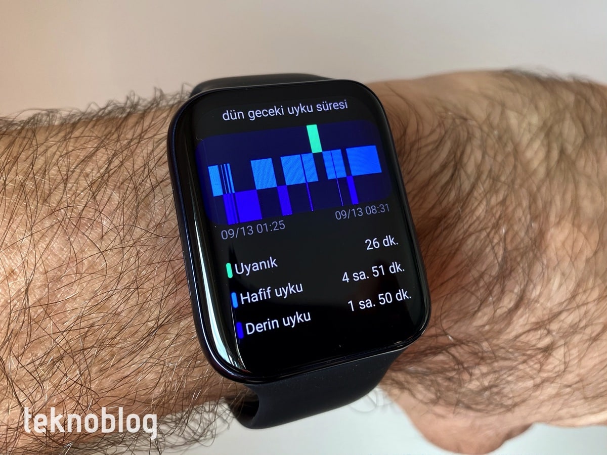Oppo’nun akıllı saatinin bir özelliği de uyku takip işlevini sunması. Eğer saati gece yatarken de takarsanız, hafif ve derin uyku aralıklarını görebilirsiniz. Saatin bunları ölçme konusunda da iyi bir performans sergilediğini görüyoruz. İlginçtir ki, uyku takibi yalnızca akşam saat 8 ile sabah 10 saatleri arasında çalışıyor.