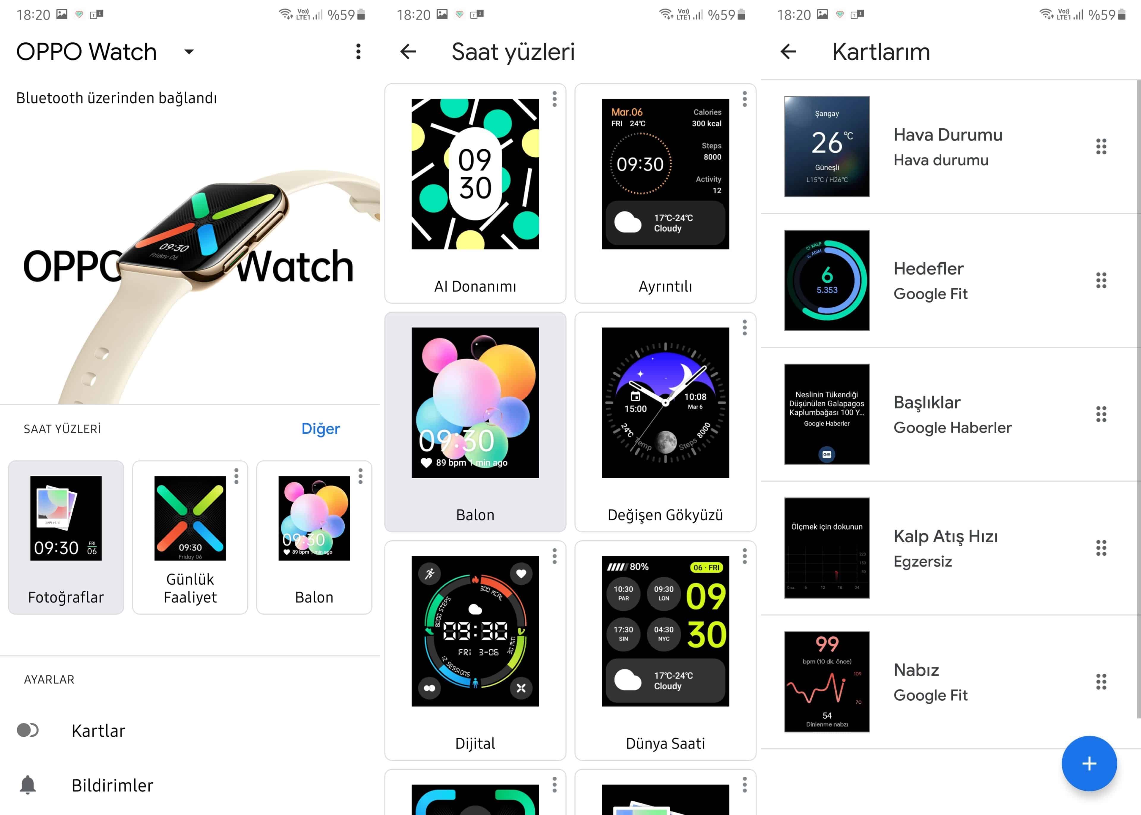 Yukarıdaki kutu açılımı videosunda da görüldüğü üzere, Oppo Watch’un kurulumunu Google’ın Wear OS yazılımı ile yapıyoruz. Ancak Google Play’den indireceğiniz HeyTap Health uygulaması sağlıklı yaşam ve egzersiz konusunda Oppo Watch’dan daha iyi şekilde yararlanmanızı sağlayacaktır. Bu uygulamada da saat yüzünü değiştirme imkanı var. AI ve Dinamik olarak adlandırılan saat yüzü ilgi çekici. Bunu kullanarak üzerinizdeki bir giysinin veya beğendiğiniz bir eşyanın renkleriyle uyumlu bir saat yüzü oluşturabilirsiniz. Ayrıca hangi uygulamanın bildirimlerinin saate yansıtılacağını da buradan belirleyebilirsiniz. Ancak burası daha çok Oppo Watch’un kaydettiği verileri daha büyük ekranda, takvim bazlı bir arayüzde görmenizi sağlıyor.