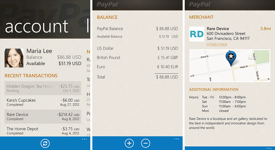 Uygulamada PayPal’ın geleneksel fonksiyonlarının yanı sıra hesabı yönetebilme seçeneği mevcut. Tıpkı iOS ve Android uygulamalarında olduğu gibi Windows Phone uygulaması ile de kullanıcılar servise entegre ettikleri işlerine gelen akışı takip edebilecekler. Kredi kartının fotoğrafını çekerek kartı bir ödeme aracı olarak kullanma gibi bazı özellikler bulunmasa da, uygulama ilk etapta ”yeterli” olarak tanımlanıyor. PayPal, Windows Phone Marketplace üstünden indirilebiliyor.