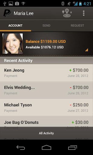 PayPal’ın Android uygulaması, yenilenmiş hali ile Google tarafından arayüzler için belirlenen ”Holo” yönergelerine uygun hale geldi. Yeni tasarım ile birlikte menülerde tıpkı iOS uygulamasında olduğu gibi kahverengi tonları hakim olmuş durumda. Arka planda ise bir cüzdanı andıran görüntüler halen varlığını sürdürüyor.