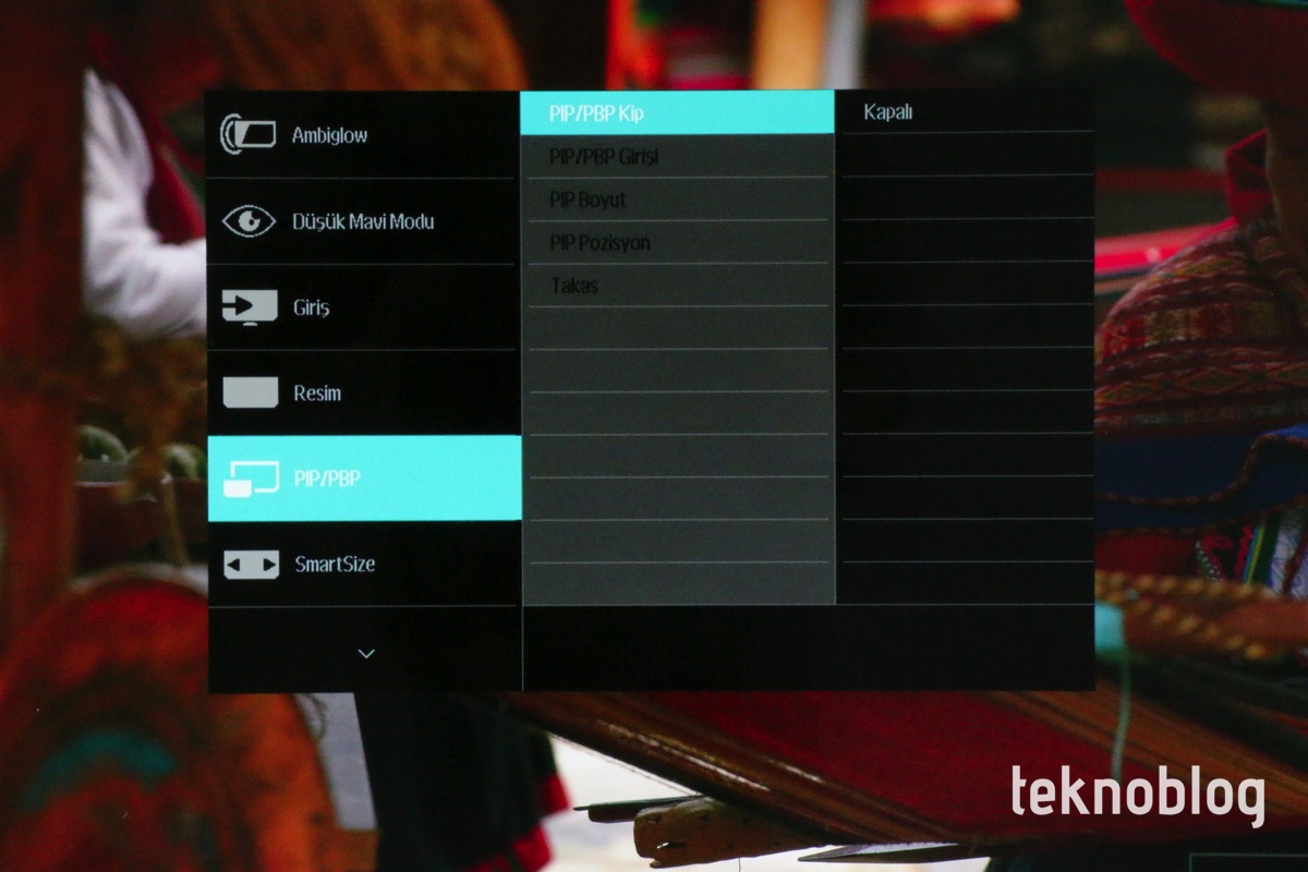 Philips 436M6’nın kontrol menüsüne arka tarafta yer alan kontrol düğmesiyle erişebilir ve bu düğmeyi sağa, sola, yukarıya ve aşağıya hareket ettirerek menülerde gezinebilir, ayarları değiştirebilirsiniz. Tabii ki, kutudan çıkan uzaktan kumanda bu açıdan daha kolay ve pratik kontrol imkanı sağlayacaktır.