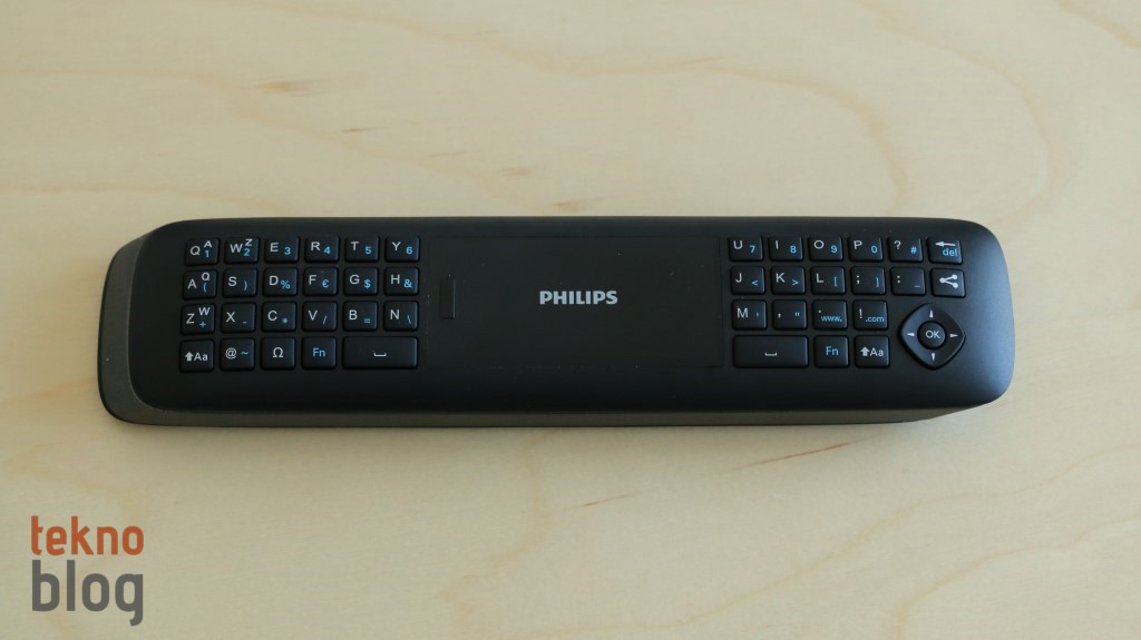 Televizyonla birlikte tek bir uzaktan kumanda geliyor. Philips’in geçen yılki üst sınıf televizyonlarıyla birlikte sunulduğunu gördüğümüz, arkasında QWERTY klavyenin bulunduğu uzaktan kumanda bu Philips TV ile birlikte sunuluyor. Bir yüzü normal bir TV kumandası gibi olan, her türlü kontrolü barındıran bu kumandanın arkasında yer alan QWERTY klavye adres, kullanıcı adı, şifre girerken yararlı oluyor.