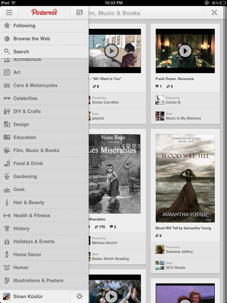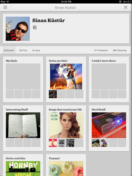 Arama menüsünde ise kullanıcılar anahtar kelimeleri girerek arama yapabilmenin dışında, Pinterest tarafından daha önceden belirlenmiş popüler kategoriler içinde de arama yapabiliyorlar. Bu kategorilerin oldukça zengin olduğunu belirtmek gerek. Modadan bilime, tarihten dövmelere kadar son derece geniş bir konu yelpazesi yer alıyor. Menü çubuğunun en altında ise kullanıcıların kendi profillerine erişmeleri için adlarının yazılı olduğu bir sekme yer alıyor. Kişisel profil sayfaları aracılığı ile kullanıcılar profillerine daha önce yerleştirdikleri içerikleri, oluşturdukları panoları görebiliyorlar. Uygulama aracılığı ile yeni bir pano oluşturmak için ise tarayıcı aracılığı ile yeni bir içerik bulmak gerekiyor. Uygulamaya ilişkin en kullanışlı özelliklerden biri de seçilen her menünün yeni bir pencere olarak açılması. Ekranın sağ üst tarafında yer alan yıllardır tanıdığımız kapatma ikonu sayesinde bu pencereleri kapatmak mümkün.