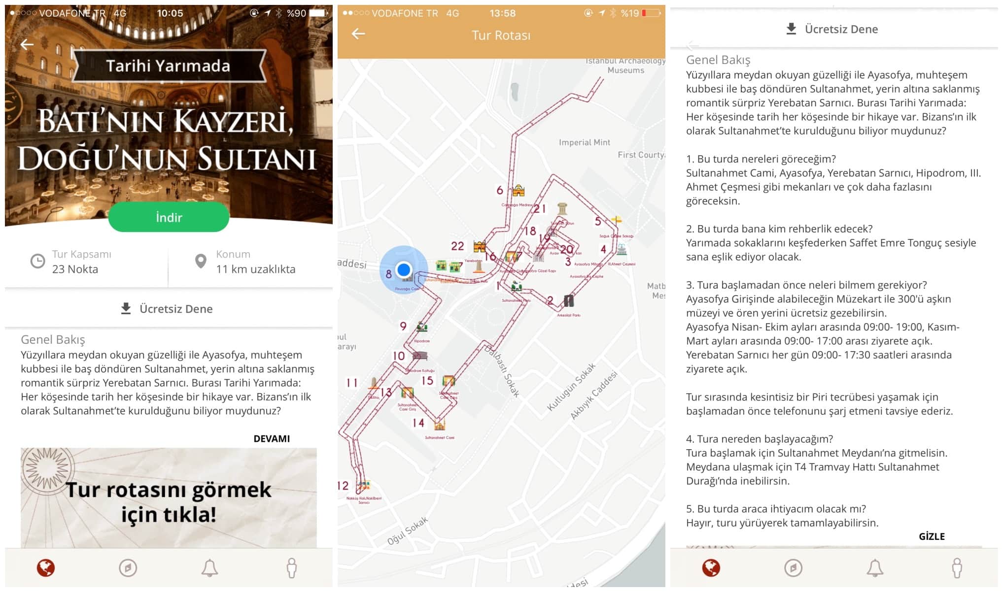 Piri uygulamasını telefonunuza ücretsiz olarak indirdikten sonra ilk olarak uygulamanın nasıl çalıştığına dair bilgiler sizinle paylaşılıyor. Sonrasında uygulamada yer alan tarihi mekanlardan gezmek istediğiniz yeri seçiyorsunuz. Turu yüklemeden önce açılan pencerede öncelikle seçtiğiniz tur kapsamında kaç noktaya uğrayacağınızın ve turun mevcut konumunuza ne kadar uzaklıkta olduğu bilgisi veriliyor. Daha sonra ise “Genel Bakış” başlığı altında bu turda görülecek yerler, turun rehberliğini üstlenecek kişi, tura başlamadan önce bilinmesi gerekenler, tura için en uygun başlangıç noktası ve turdaki araç ihtiyacına ilişkin bilgiler ayrıntılı olarak “Genel Bakış” başlığı altında veriliyor. Ayrıca bu turda size eşlik eden rehberin gezi sırasında mutlaka uğramanız gereken mekanlarla ilgili önerileri de mevcut. Tur rotası içinde gezilecek noktaların bilgileri bir harita ile kullanıcılara aktarılıyor.