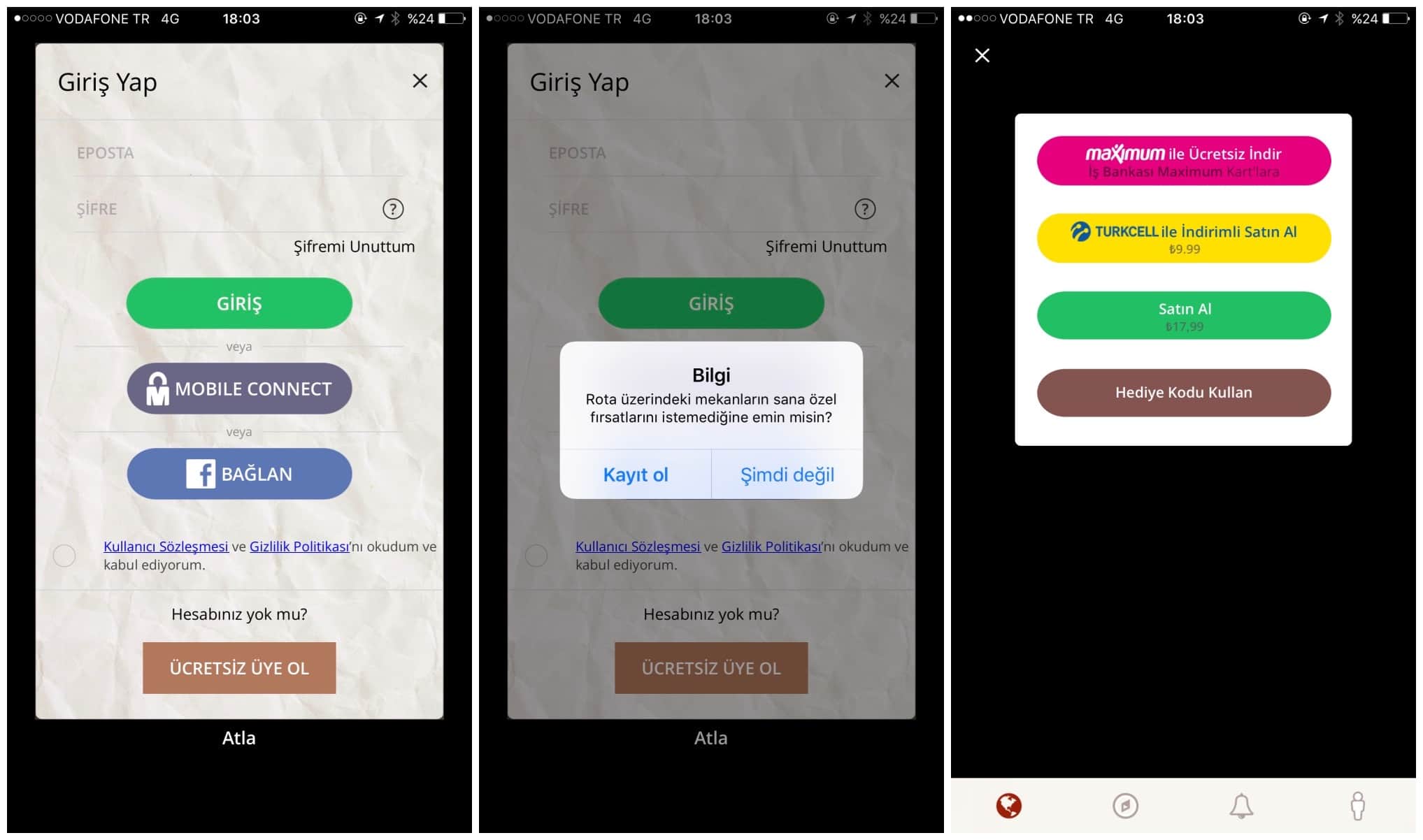 Başlangıç sayfasında seçtiğiniz tur için Yükle seçeneğine tıkladığınızda karşınıza Giriş yapmanızı isteyen bir ekran geliyor. Bu adımda Giriş yapmadan ilerlemek mümkün ancak gezi sırasında yolunuzun üzerindeki mekanların size özel fırsatlarından yararlanmanız için giriş yapmanız şart. Uygulama ücretsiz ancak tur programları için ücret talep ediliyor. Maximum Kart ile ücretsiz erişilebilen bir tur programına Turkcell aboneleri 9,99 TL, diğer kullanıcılar ise 17,99 TL ödeyerek sahip olabiliyor.