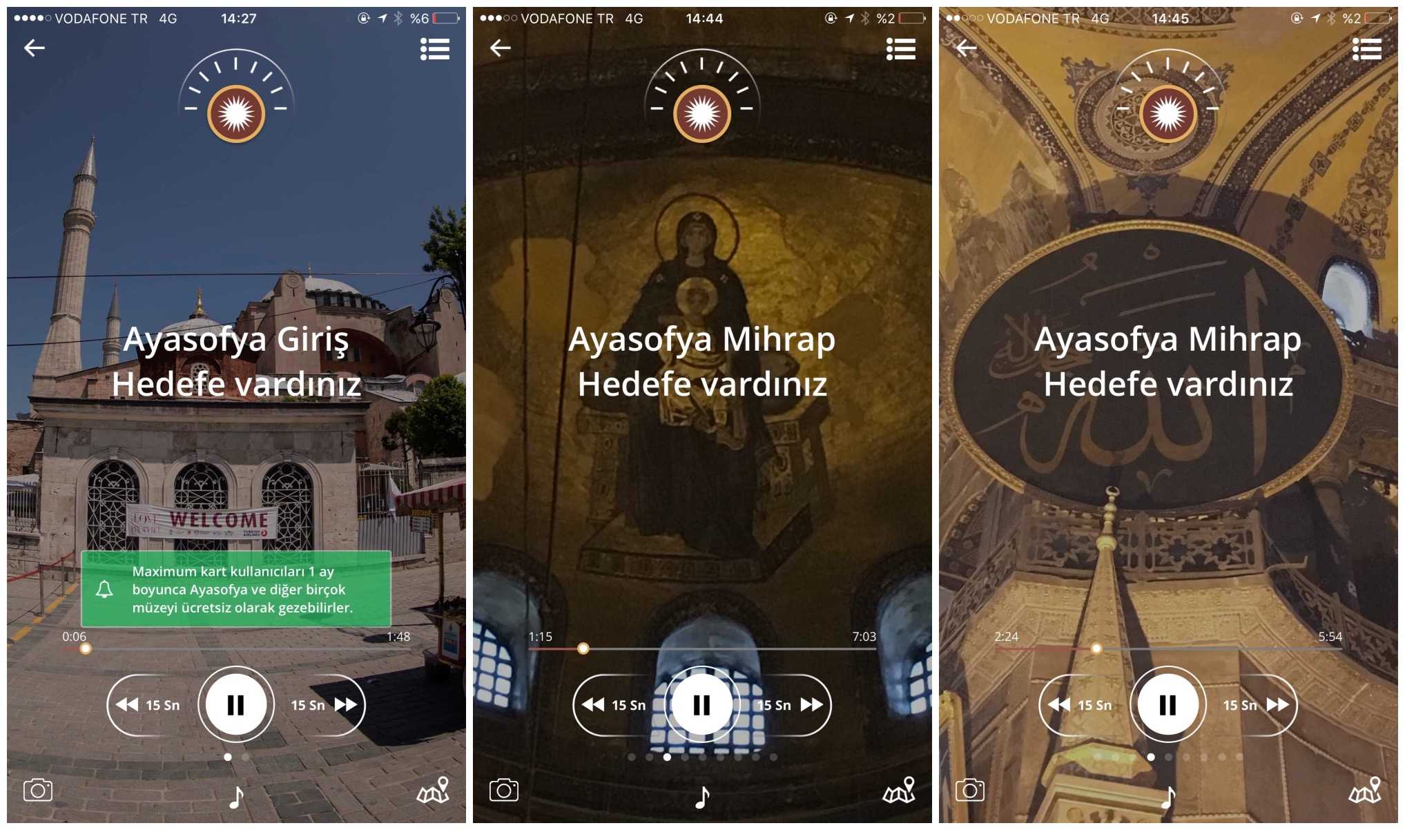 Önerilen veya kendinizin seçtiği bir başlangıç noktasına vardığınızda ekranda hikayeyi dinleyebilmeniz için “oynat” tuşu beliriyor. Rehber, mekan ile ilgili hikayeyi anlatırken telefonunuzun ekranında mekan detaylarının resimleri beliriyor. Bu sayede hangi detayların anlatıldığı da kolayca anlaşılıyor.
