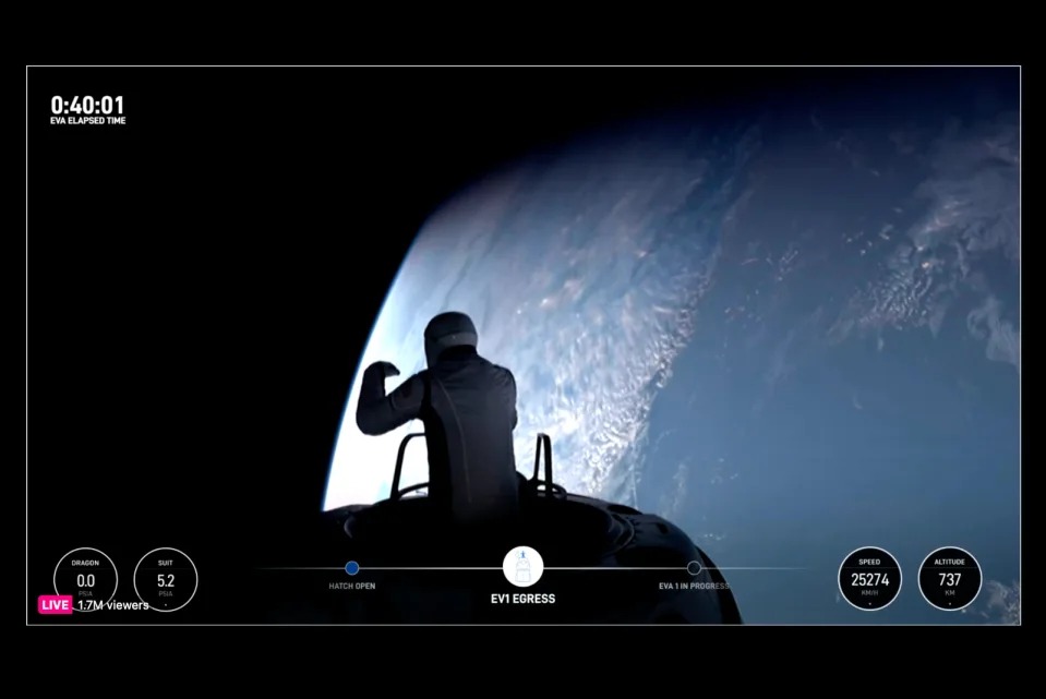 Astronotların giysileri, sızıntı testi amacıyla saf oksijenle doldurulduktan sonra, aracın içindeki hava boşaltıldı. Bu adımların ardından görev komutanı Jared Isaacman, saat 14.00’e doğru kapsülden çıkarak uzaya adım attı. Bu tarihi an, SpaceX’in kameraları tarafından kaydedildi. Isaacman, Dünya’nın göz kamaştırıcı manzarası önünde siluetini bırakarak, planlanan bir dizi hareket testini gerçekleştirdi. Bu testler, SpaceX’in yeni geliştirdiği dış uzay giysilerinin performansını değerlendirmeyi amaçlıyordu. Isaacman, yaklaşık bir saat süren bu testlerden sonra kapsüle geri döndü.