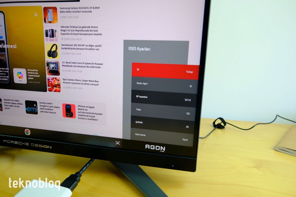 Bu arada Porsche Design AOC Agon Pro PD27S’nin sahip olduğu şık ve havalı ayak, kablo karmaşasını ortadan kaldıracak biçimde tasarlanmış. Monitörle bağlantı bölümünde yer alan boşluk içinden kabloları geçirerek onların daha düzenli bir şekilde organize edilmesini sağlayabilirsiniz. Yukarıda da belirttiğimiz gibi, aşağı doğru bakan port tasarımı da kablo organizasyonu daha kolay ve zahmetsiz hâle getiriyor.