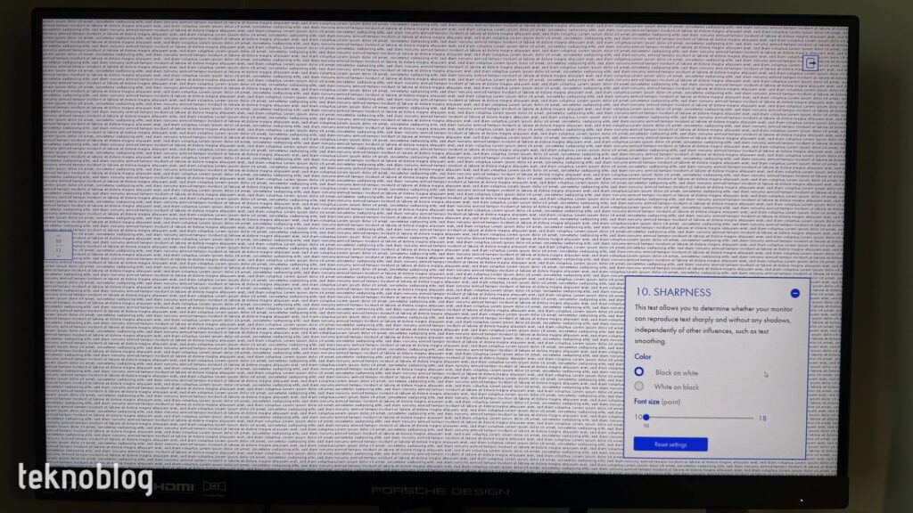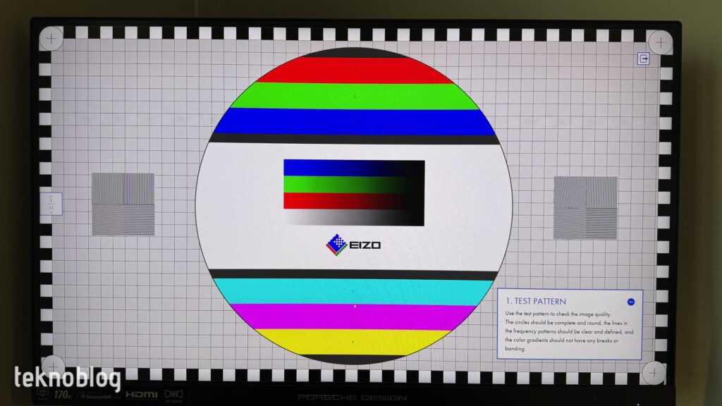 PD27S’i çeşitli monitör testlerinden geçirdik. EIZO’nun monitör test dizisine baktığımızda, test pattern’inde renklerde herhangi bir dalgalanma veya bantlanma yok, çizgiler ise tam ve keskin biçimde, herhangi bir kesinti yok. “Uniformity” testinde ise ekran parlaklığı gri renk tonunun tümünde homojen biçimde dağıtılıyor. Gradyan testinde de renk değişimi boyunca parlaklığın dağıtımı düzenli. PD27S, keskinlik testinde de sınıfı geçmeyi başarıyor. Ekrandaki metin, farklı boyutlarda bile gölgesiz, keskin ve okunaklı bir görünüm sunuyor. Görüş açısı testinde, ekranda görünen dairelerin boyutları, ekrana bakış açısı 135 derecenin üstüne çıktığında yüzde 30 civarında bir azalma gösteriyor. Yine de, yukarıda belirttiğimiz gibi, görüş açıları çok yüksek seviyeye çıksa bile ekrandaki görsel deneyimde ve kalitede bozulma daha düşük seviyede kalıyor. Gamma testinde ise monitörün gamma değeri sRGB seviyesinde çıkıyor.