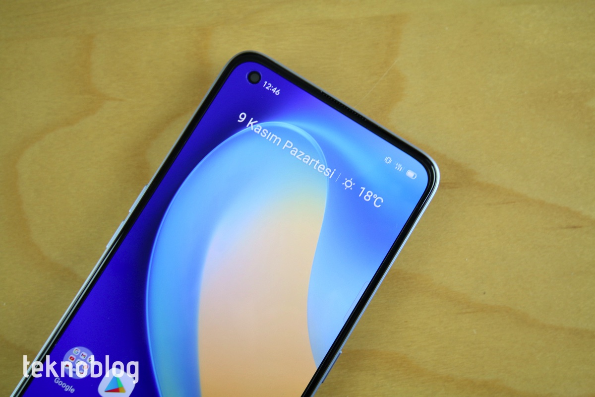 Realme 7 Pro, “Daima Açık Ekran” özelliğine sahip. Bu da ekranın her an saati ve gelen bildirimlere ilişkin ikonları gösterebileceği anlamına geliyor. Ekranın sol üst köşesinde yuvarlak kamera deliği bulunuyor. Ekran parmak izi tarayıcısını da içinde barındırıyor.