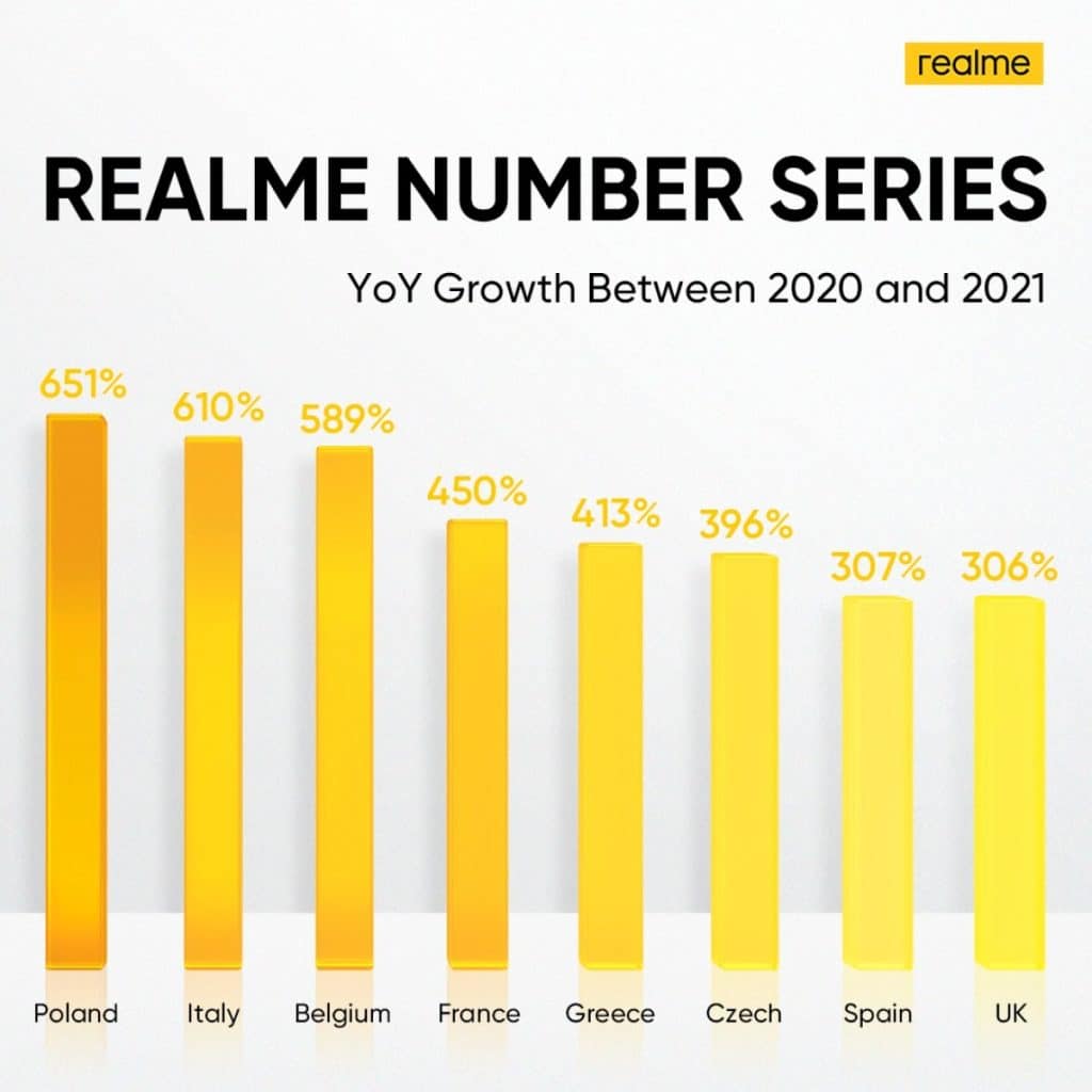 Realme, MediaTek’in işlemcileriyle Avrupa’yı uygun fiyatlarla 5G telefonlarla buluşturmayı ve etkileyici büyümesini biraz daha hızlandırmayı hedefliyor. Hemen aşağıdaki görselde Realme’nin sayı serisi cihazlarının Avrupa’daki yıllık büyüme oranlarını görmek mümkün oluyor.