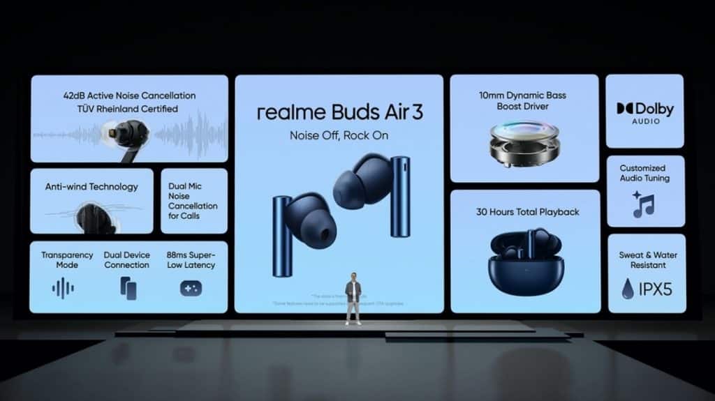 Buds Air 3 ise Realme’nin Hibrit Aktif Gürültü Engelleme özelliğini sunduğu en yeni kablosuz kulaklık oldu. 10 nm sürücülerin bulunduğu kulaklık, ortam sesini 42 dB’e kadar azaltabiliyor. IPX5 dayanıklılık sertifikasına ve Bluetooth 5.2 desteğine sahip kulaklık, şarj kutusunun da desteğiyle 30 saat boyunca müzik dinleme imkanı vadediyor.