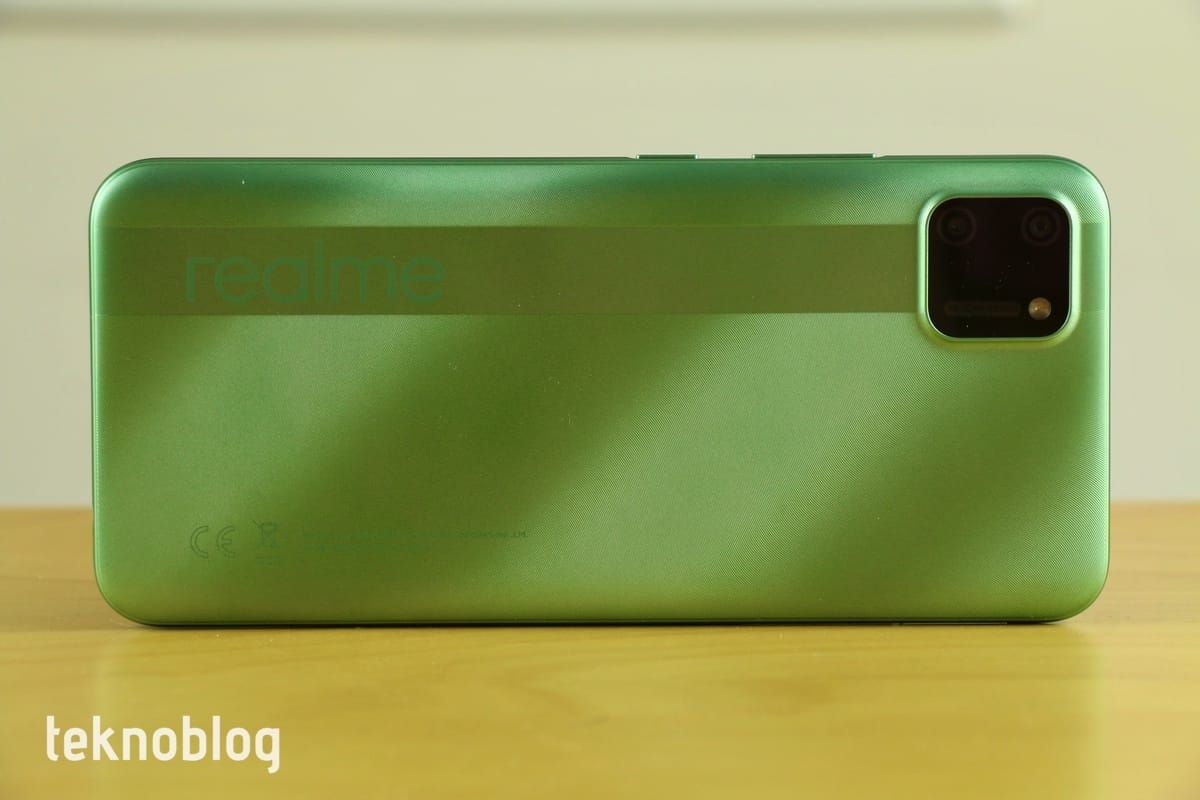 Panelin sol üst köşesinde çift kamera ve LED flaşın bulunduğu kare şeklindeki kamera modülü bulunuyor. Bu modülün hemen altından çıkan şeritin alt kısmında “Realme” logosu yer alıyor. Şeritte kullanılan yeşil tonunun farklı olması da arka panelin görüntüsüne biraz daha dinamizm kazandırıyor.