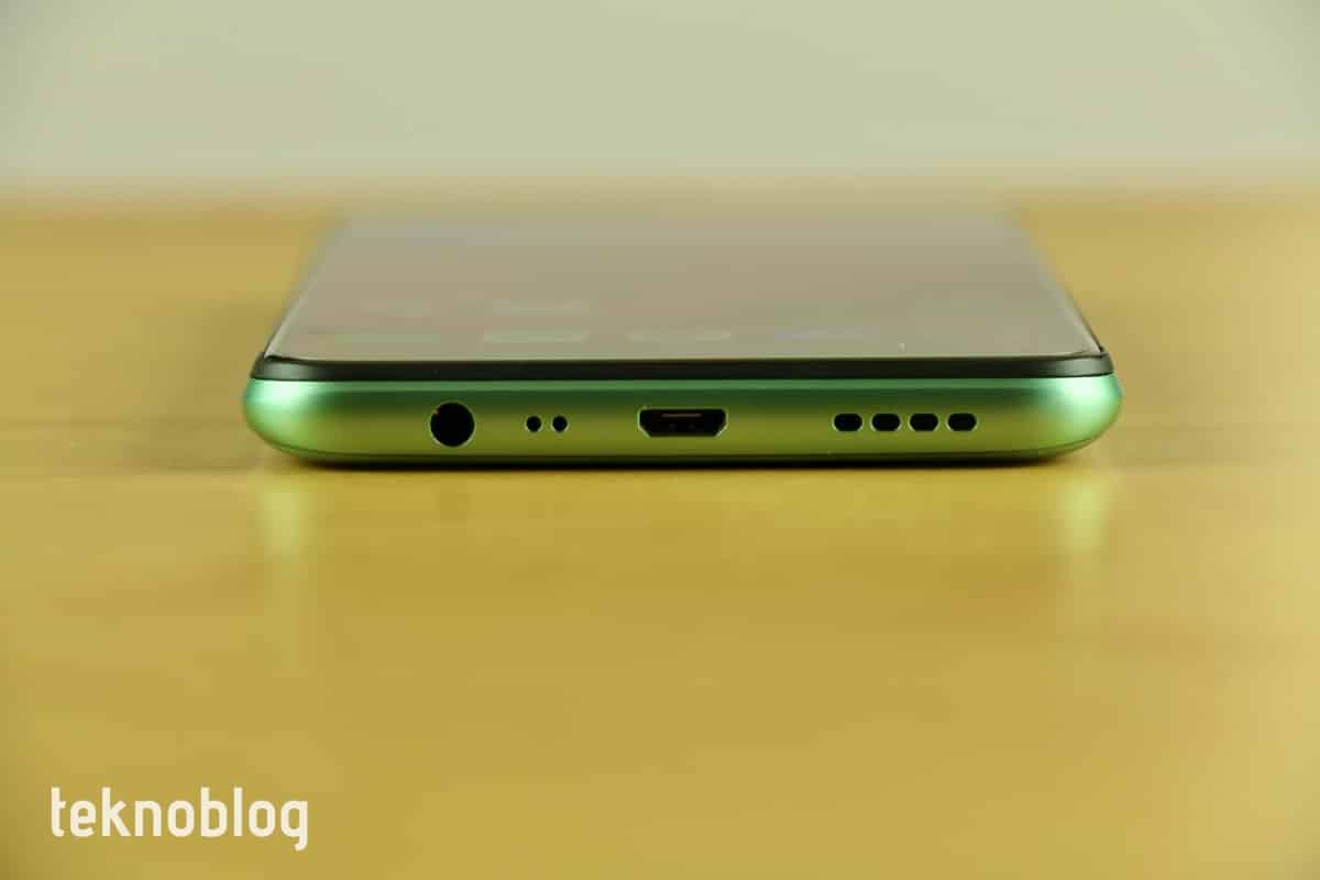 Realme C11’in alt kenarı ise oldukça kalabalık. Burada soldan sağa doğru sırasıyla 3.5 mm. kulaklık jakı, çift mikrofon, microUSB girişi ve hoparlör ızgarası bulunuyor. Bu noktada hoparlör ızgarasının performansından da biraz bahsetmekte fayda var. Hoparlörden çıkan sesin yüksekliğinin makul olduğu söylenebilir. Sesin kalitesi ise telefonun içinde bulunduğu fiyat segmentinin standartlarına paralel olarak ortalama seviyede.