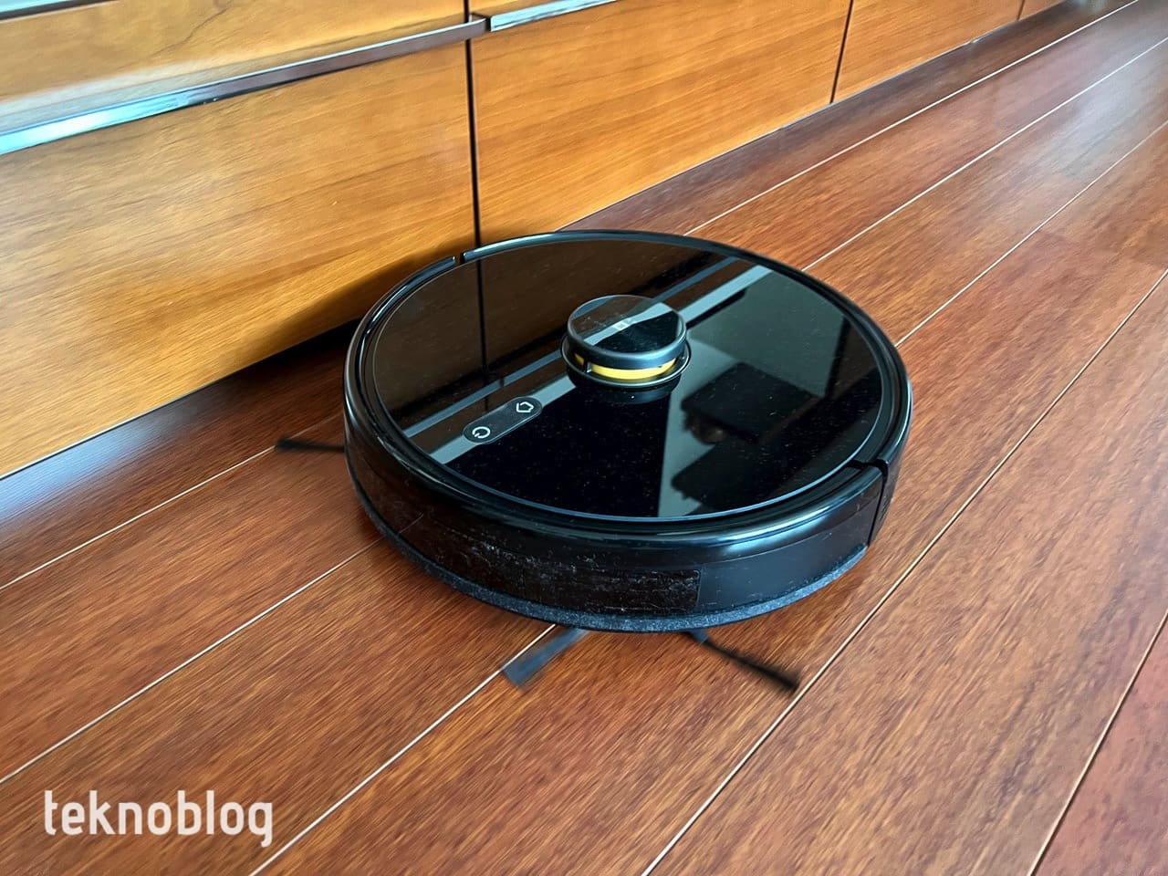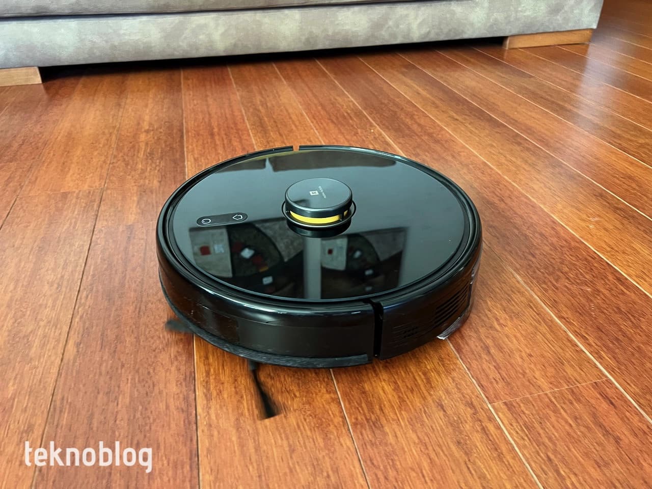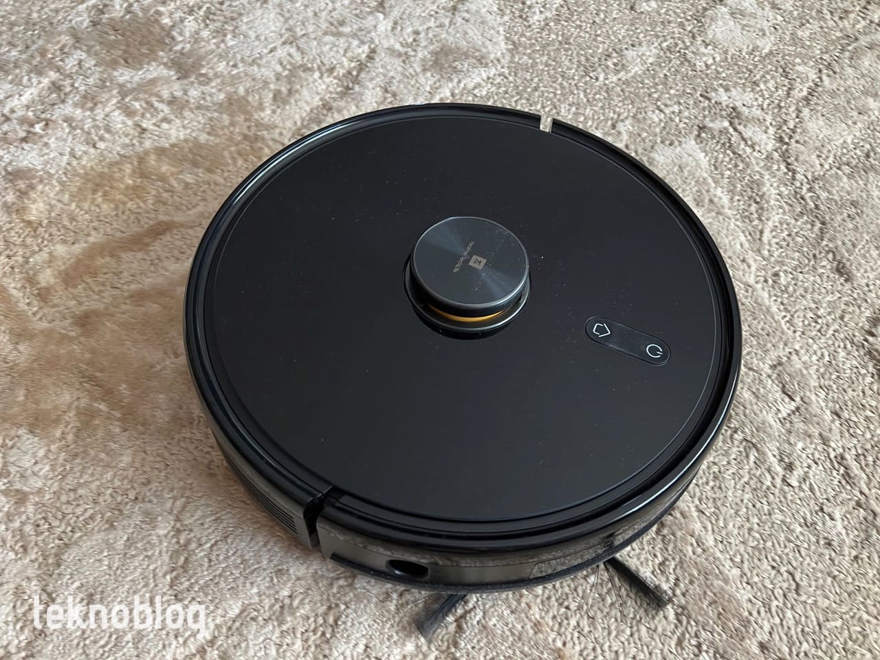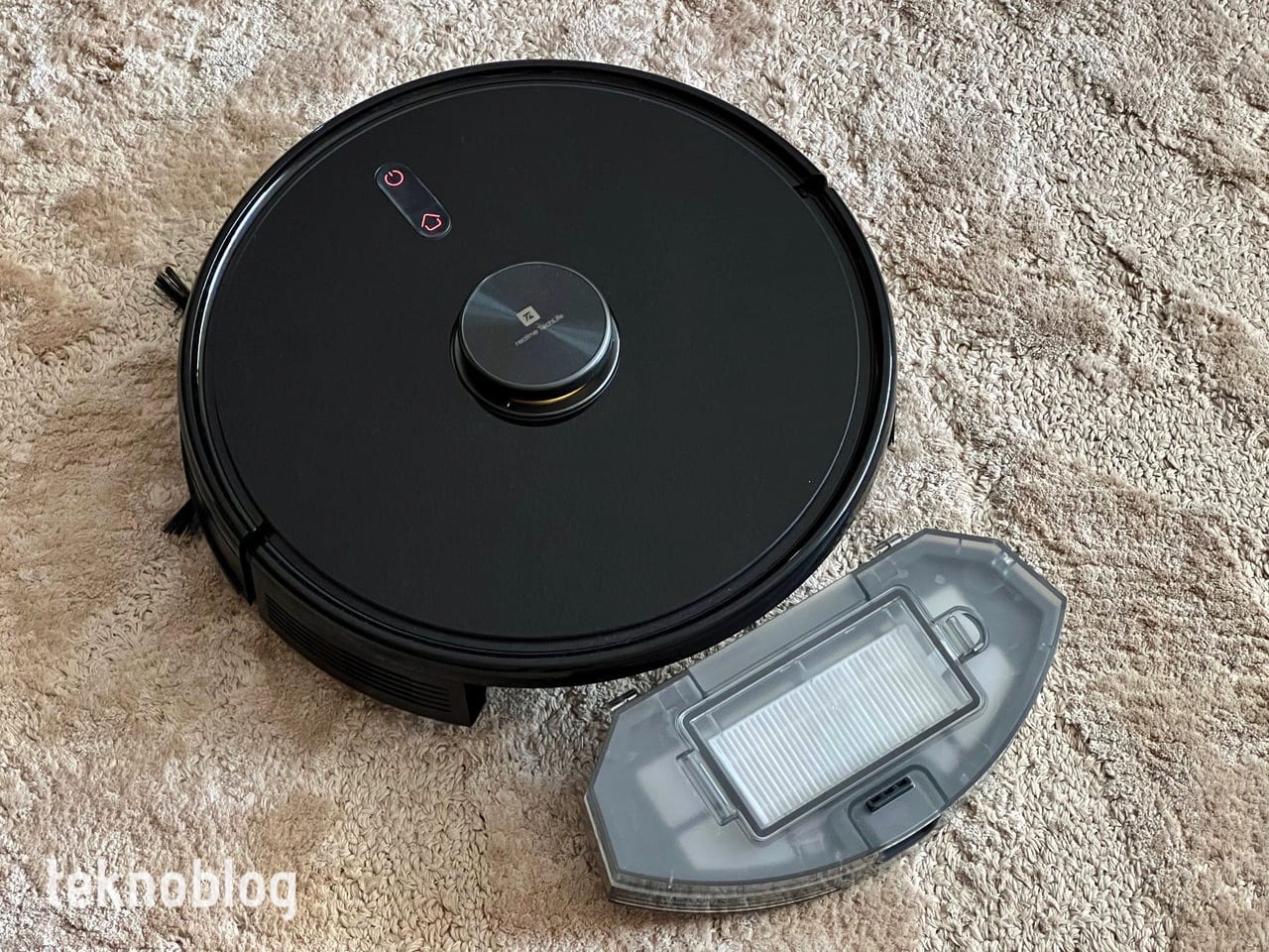 TechLife, 10 cm’lik yüksekliğiyle yatay veya koltuk altı gibi birçok bölgeye rahatlıkla giriyor. Mobilyaların kapakları genellikle 10 cm üzerinde yükseklikte olur ve bu durum, robot süpürgenin ince temizliklerde buralara da rahatlıkla nüfuz etmesini sağlıyor. Siyah ve parlak yüzeyinin toz ve kiri tutma konusunda epey hevesli olduğunu belirtelim. Sıklıkla bunun yüzeyini temizlemeniz gerekebilir. Bununla birlikte şık bir görünüme sahip olduğunu belirtelim. Üst kısmındaki sensör bölümünde yer alan sarı renkli bölüm sayesinde bunun bir Realme ürünü olduğunu anlayabilirsiniz. Üstünde yer alan iki fiziksel düğme, robotun çalışmasını duraklatma veya devam ettirme ile şarj istasyonuna geri dönme komutları için kullanılıyor.
