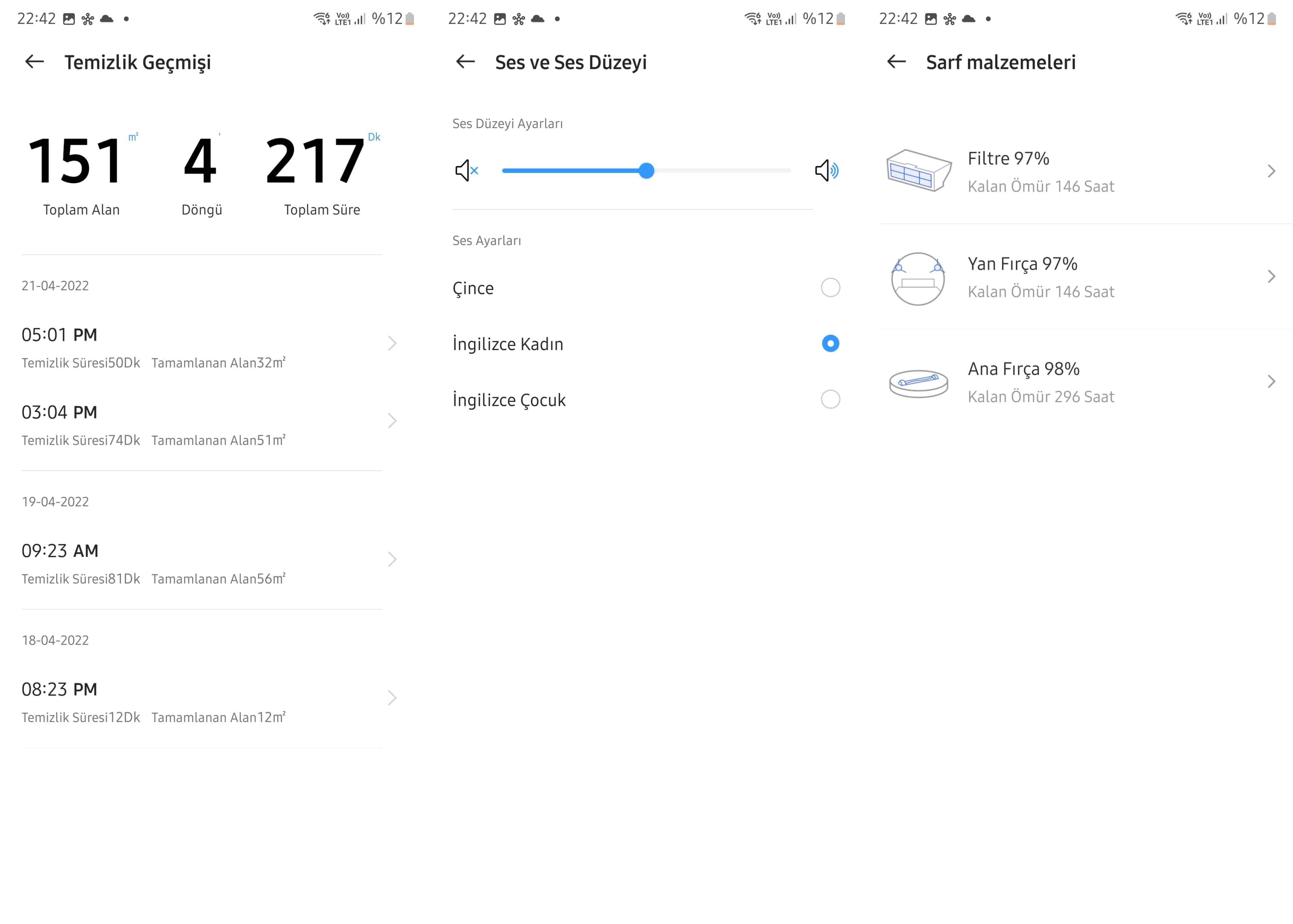 Sarf malzemeleri bölümü altında ise Filtre, Yan Fırça, Ana Fırça gibi bileşenlerin kalan ömürlerini yüzde ve saat cinsinden görebilirsiniz. Belirlenen sürelerin sonuna gelindiğinde bunları değiştirmeniz, robot süpürgenin iyi biçimde işlemesi için büyük önem taşıyor.