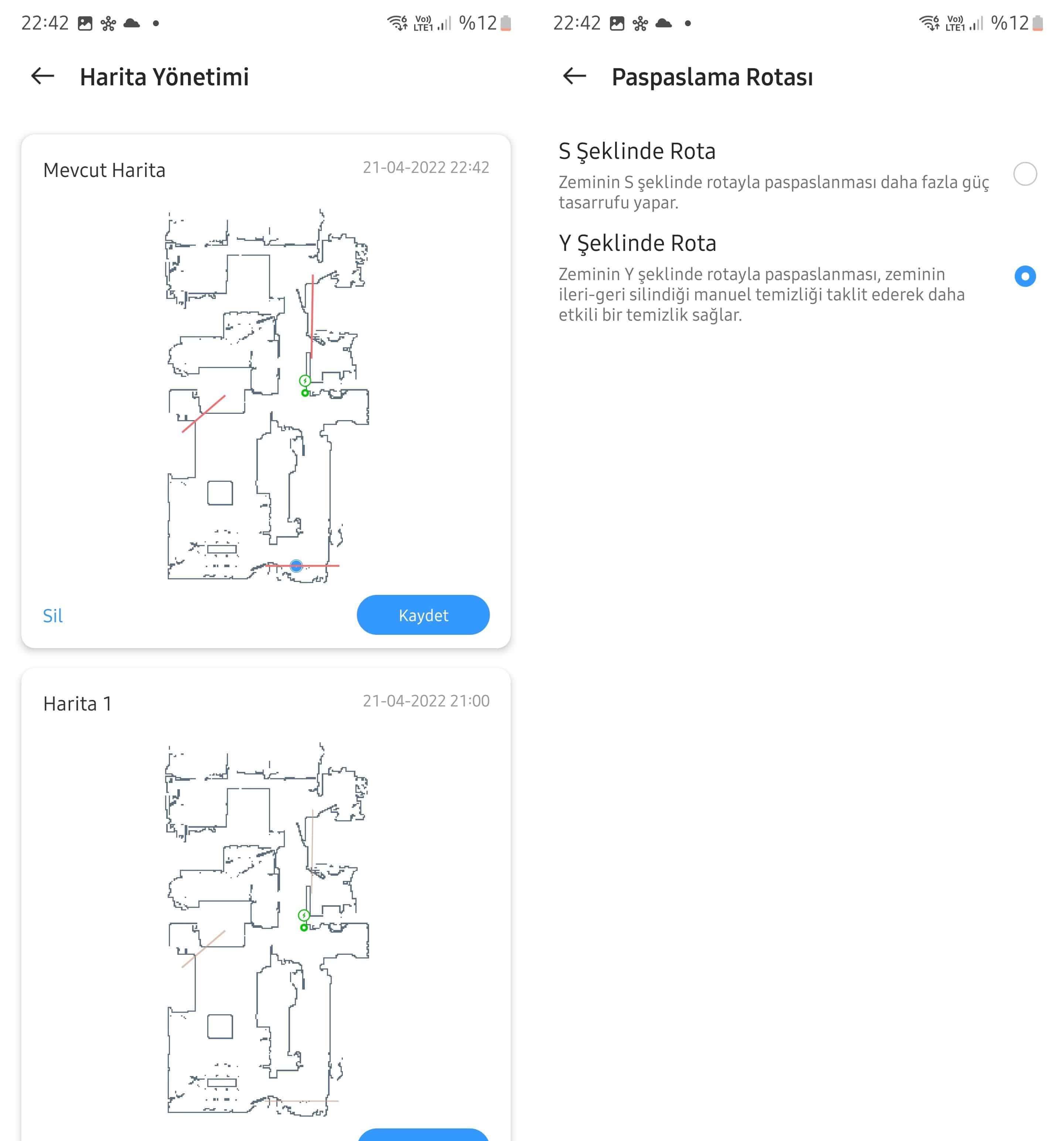 Harita bölümü farklı haritalar oluşturup bunları düzenleme ve TechLife robot süpürgenin bunlardan bir tanesini kullanmasını sağlayacak biçimde ayarlama işlerini yapmaya yarıyor. Robotu Bul seçeneği ise, tek bir dokunuşta robotun sesli yanıtını etkinleştiriyor ve robot “I’m Here”, yani “Buradayım” diyerek nerede olduğunu belli ediyor. Paspaslama rotası bölümünden robotun paspaslama sırasında S veya Y rotalarını izlemesini sağlayabilirsiniz. S seçeneği pili daha idareli biçimde kullanırken Y rotası, klasik bir paspasın hareketini taklit ettiği için daha etkili temizlik sağlıyor.