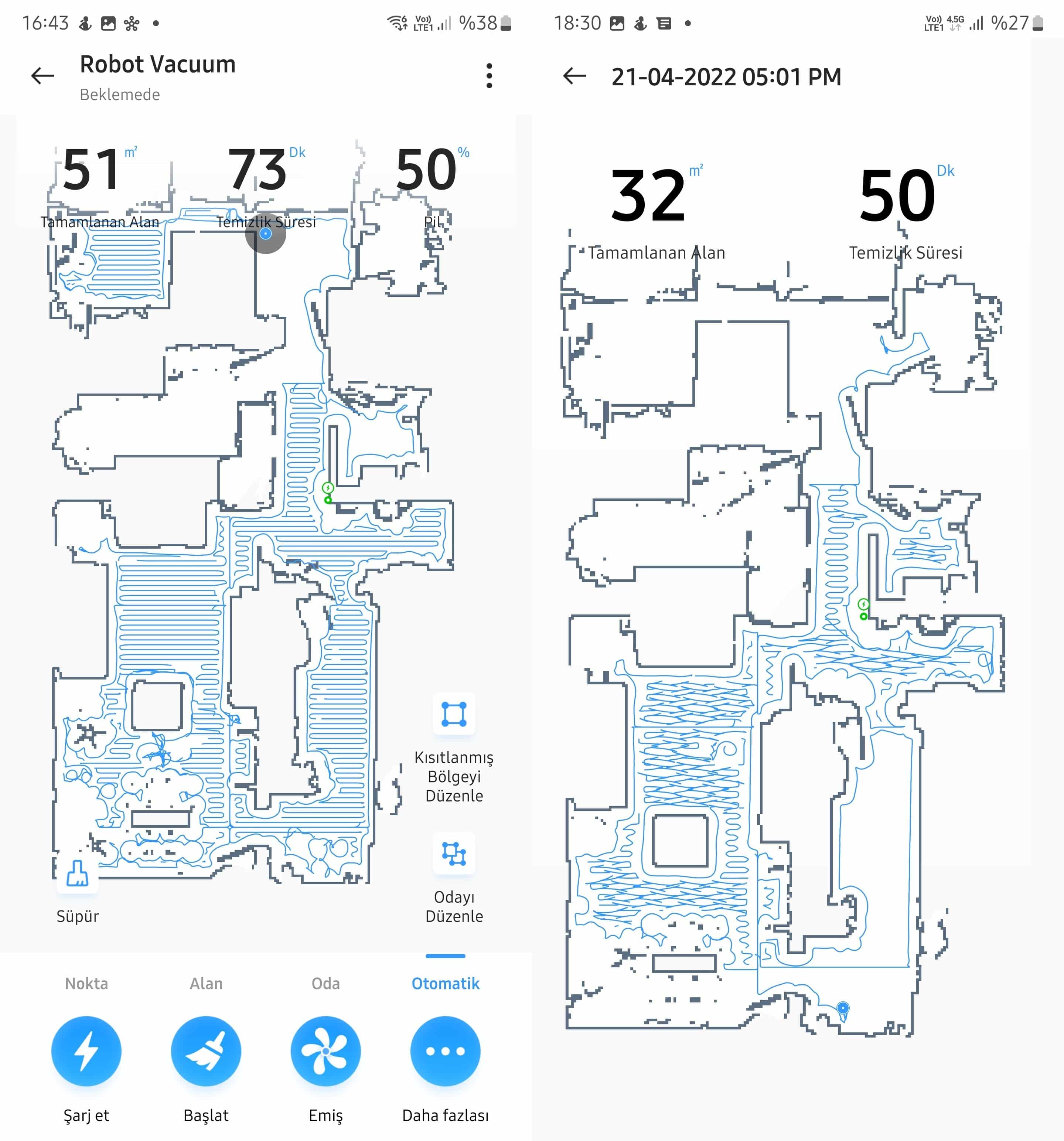 Yukarıda Realme TechLife Robot Süpürgenin tek bir şarjla 5 saate kadar temizlik yapabileceğini belirtmiştik. Robot süpürgenin ortalama 60-70 metrekarelik bir temizleme yüzeyini, yeniden şarja ihtiyaç duymadan tek seferde süpürebildiğini veya paspaslayabildiğini gördük. Seçtiğiniz emiş gücüne veya paspaslama rotasına göre pil ömrü de değişiklik gösterecektir. 150-200 metrekarelik evlerin bile tek bir şarjla tamamen temizlenebileceğini söyleyebiliriz.