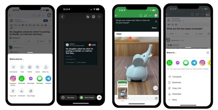 Bir diğer yenilik de Reddit içeriğini ekran görüntüsü almadan veya telefona içerik indirmeye gerek kalmadan doğrudan Instagram hikayelerinde paylaşabilmek. Kullanıcılar paylaş ikonuna dokunduklarına karşılarına sık kullandıkları sosyal platformları gösteren bir sayfa çıkıyor. Bu sayfa üzerinden platformu terk etmeden başka bir platformda paylaşım yapmak mümkün oluyor. Buna ek olarak, tek bir dokunuşla başka uygulamalarda ekran görüntüsü de paylaşılabiliyor. Başka uygulamalarda bu ekran görüntüsüne tıkladığında karşılarına ilgili içerik çıkıyor.