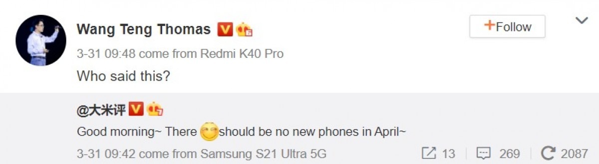 Bunun işaretini Redmi’nin ürün direktörü Wang Teng Thomas, Çin’in popüler sosyal ağı Weibo’da verdi. Bir kullanıcının “Nisan ayında yeni ürün çıkmayacak” şeklindeki paylaşımını Thomas, “Bunu kim söyledi?” şeklinde yanıtladı.